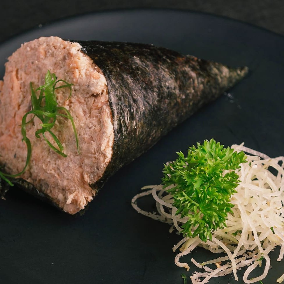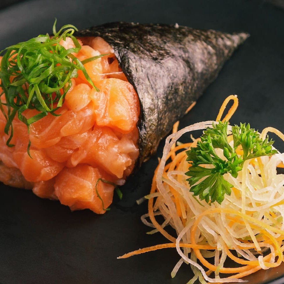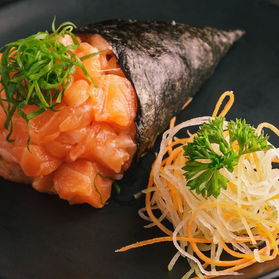 Arroz gohan e salmão fresco envoltos na alga nori, em forma de cone. (Acompanha: hashi, shoyu e teriaki)
