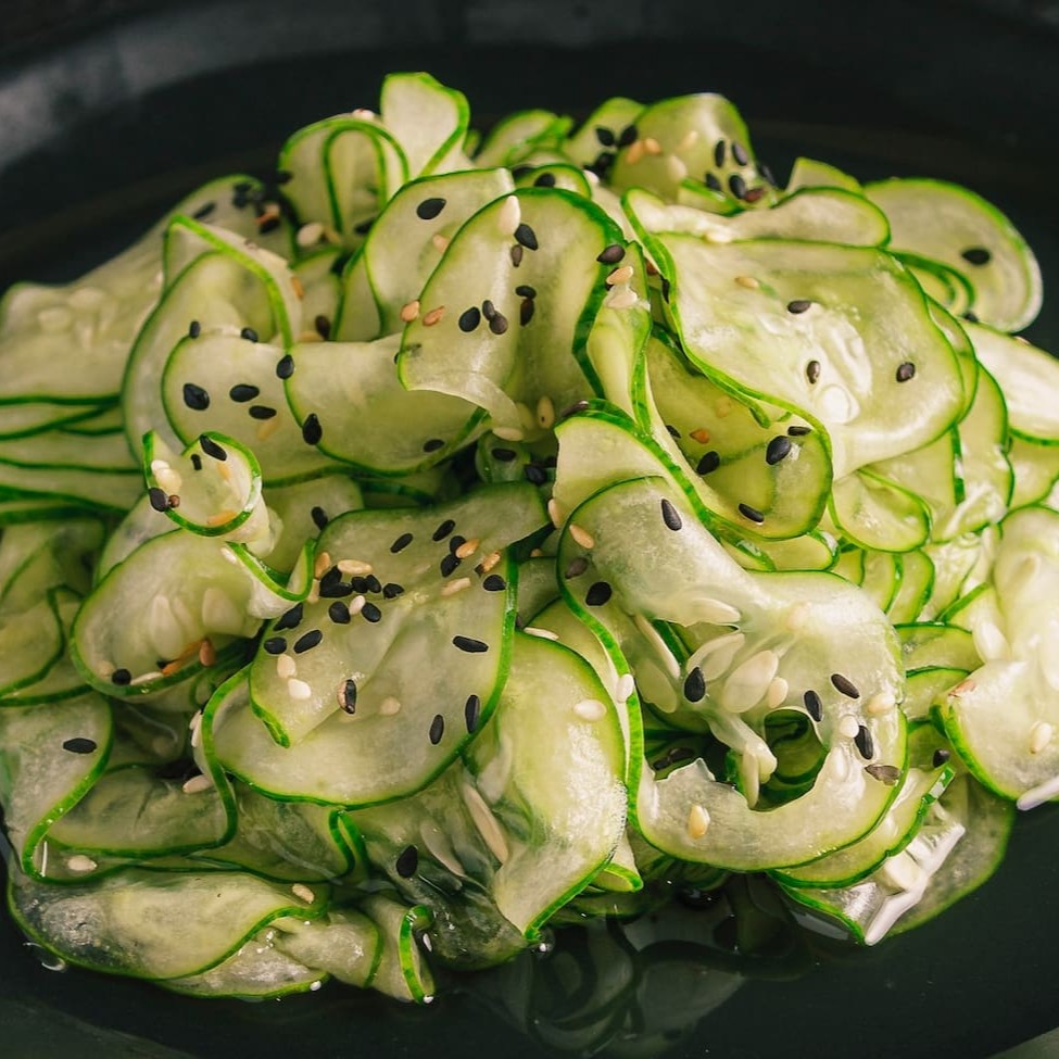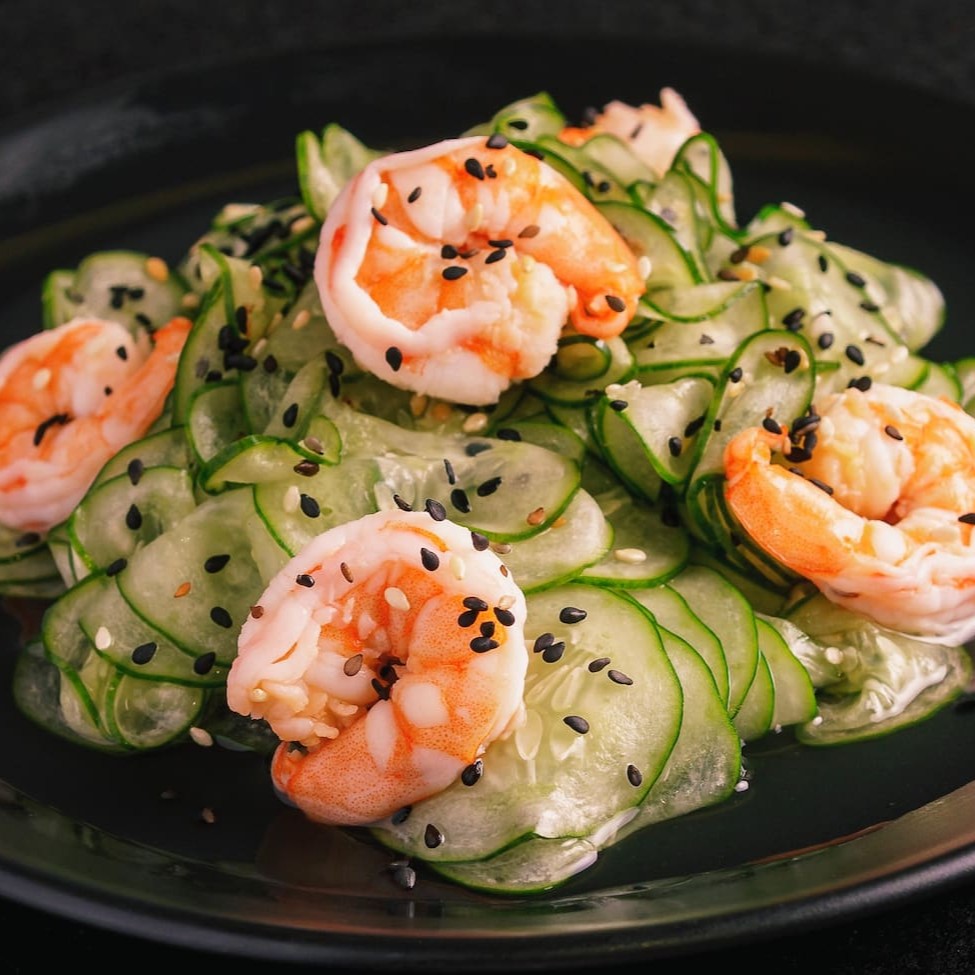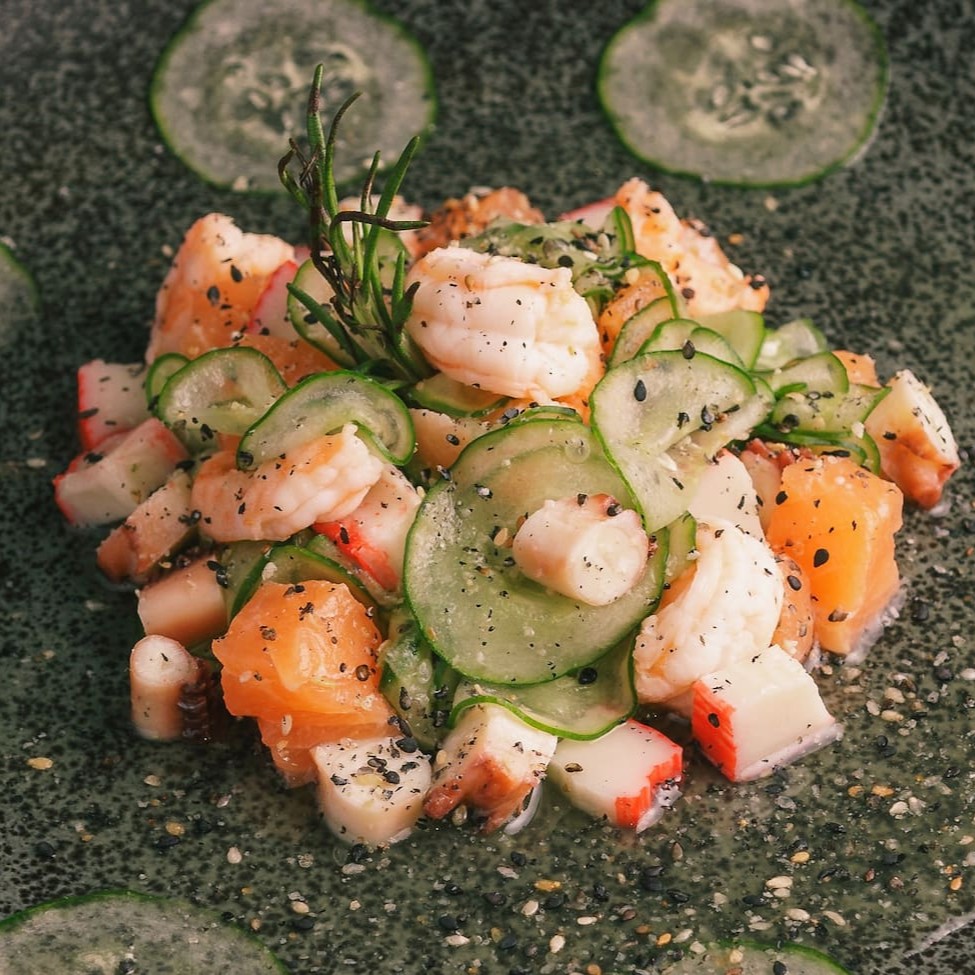 Salada de pepino japonês acompanhada de salmão, polvo, peixe branco, camarões e kani frescos, e gergelim. (300g)
