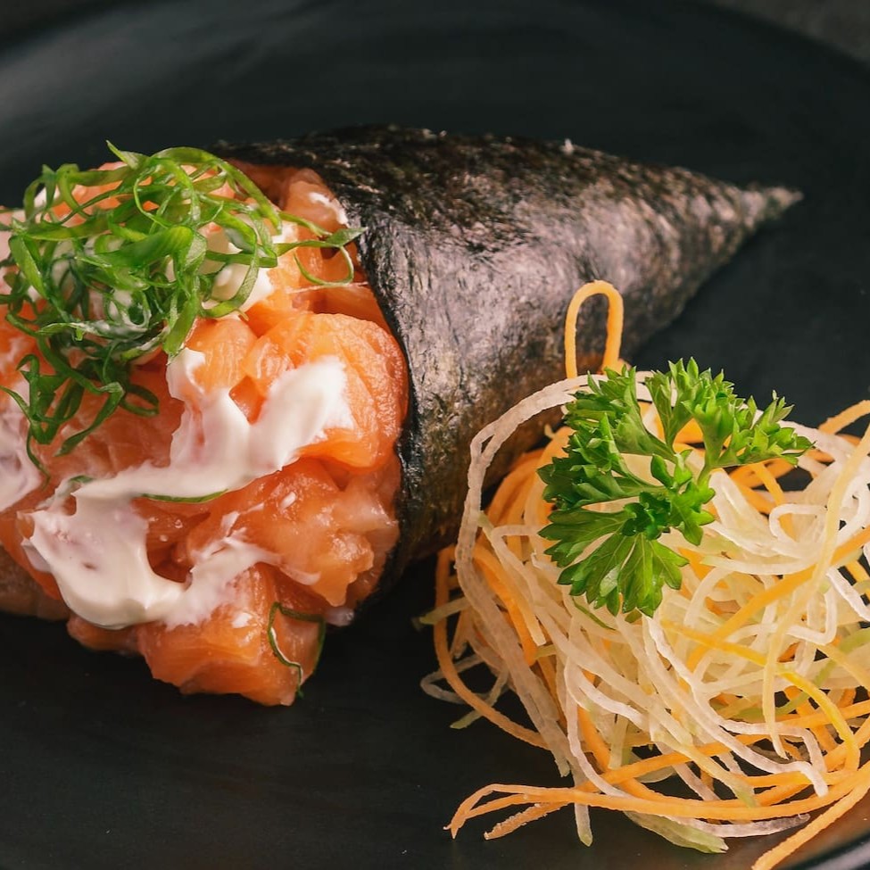 Enrolado de salmão maçaricado em forma de cone, recheado com salmão fresco e cream cheese e arroz gohan, coberto com molho de ervas, molho teriyaki, geléia de rubras e cebolinha. (Acompanha: hashi, shoyu e teriaki)