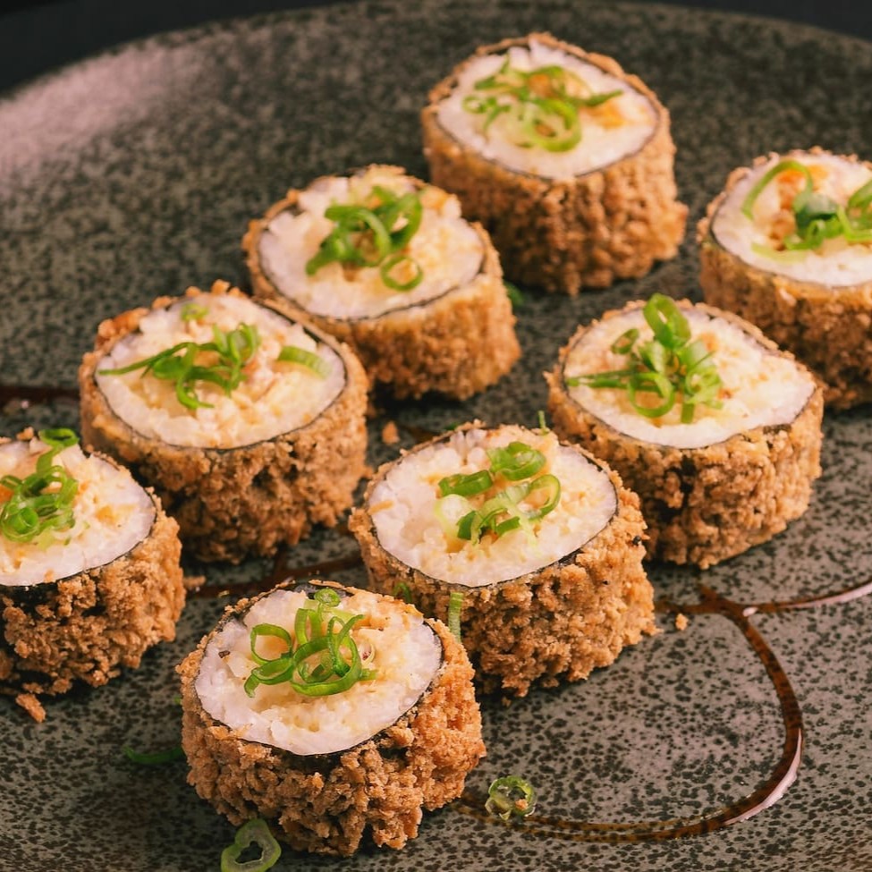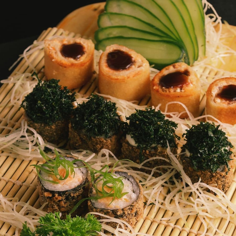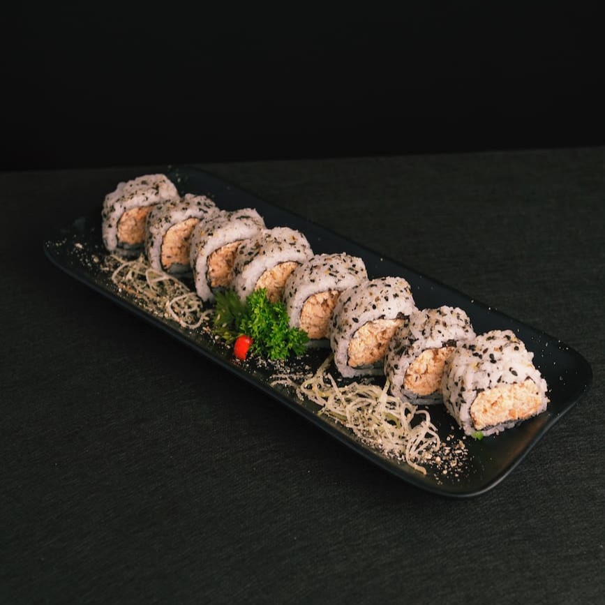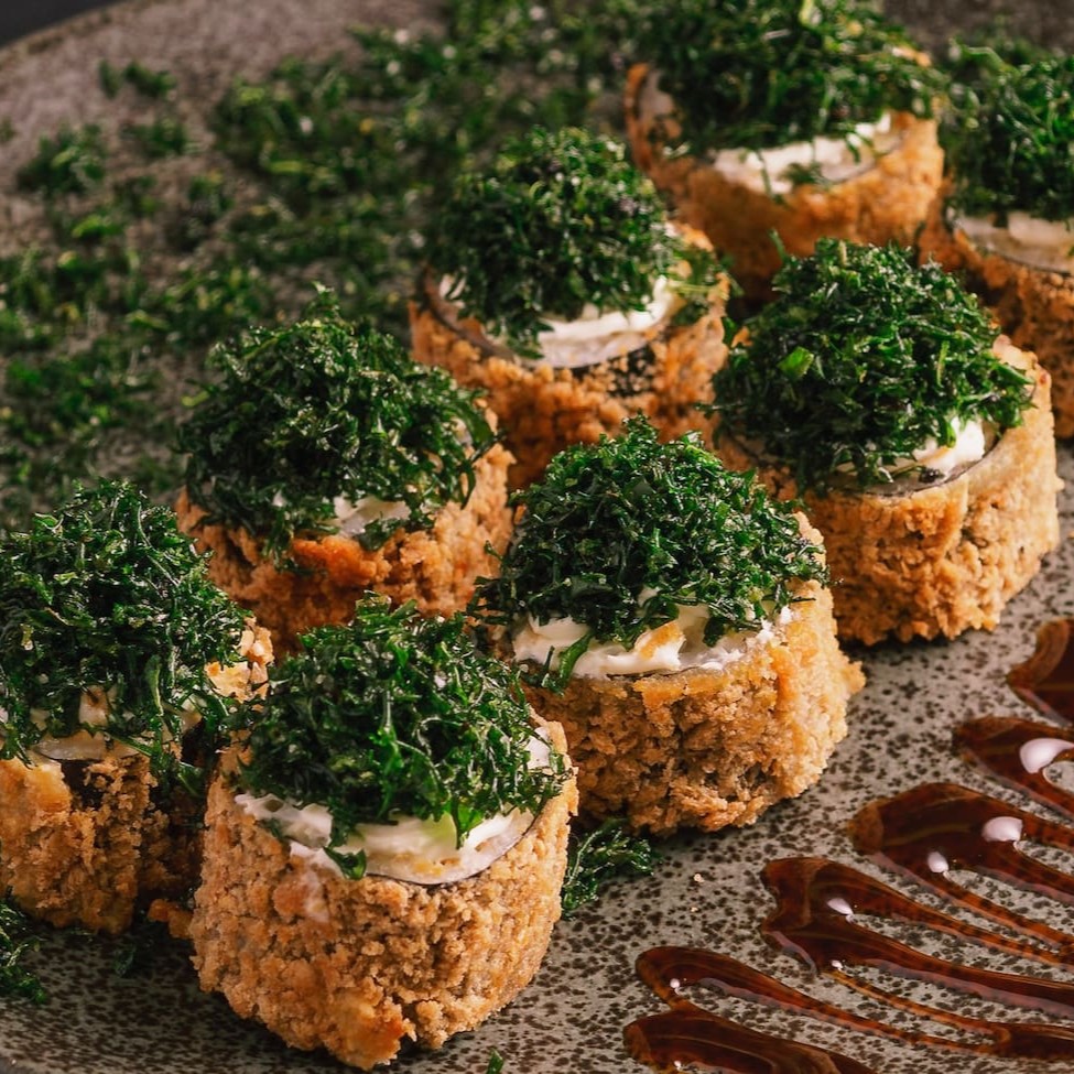 Enrolado de alga nori empanada na farinha de panko, recheado com salmão grelhado e cream cheese, coberto com crispy de couve caramelizado.