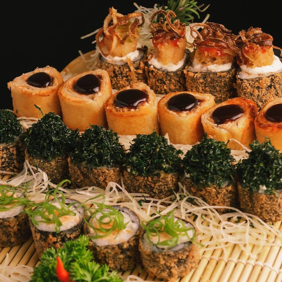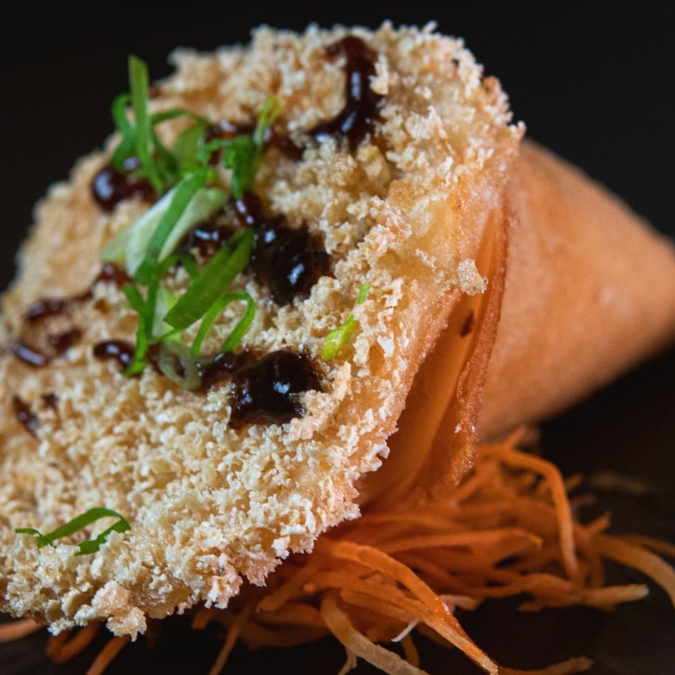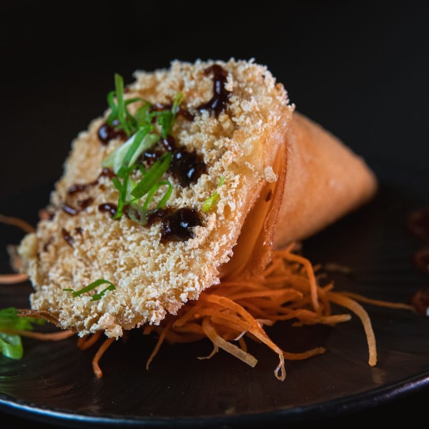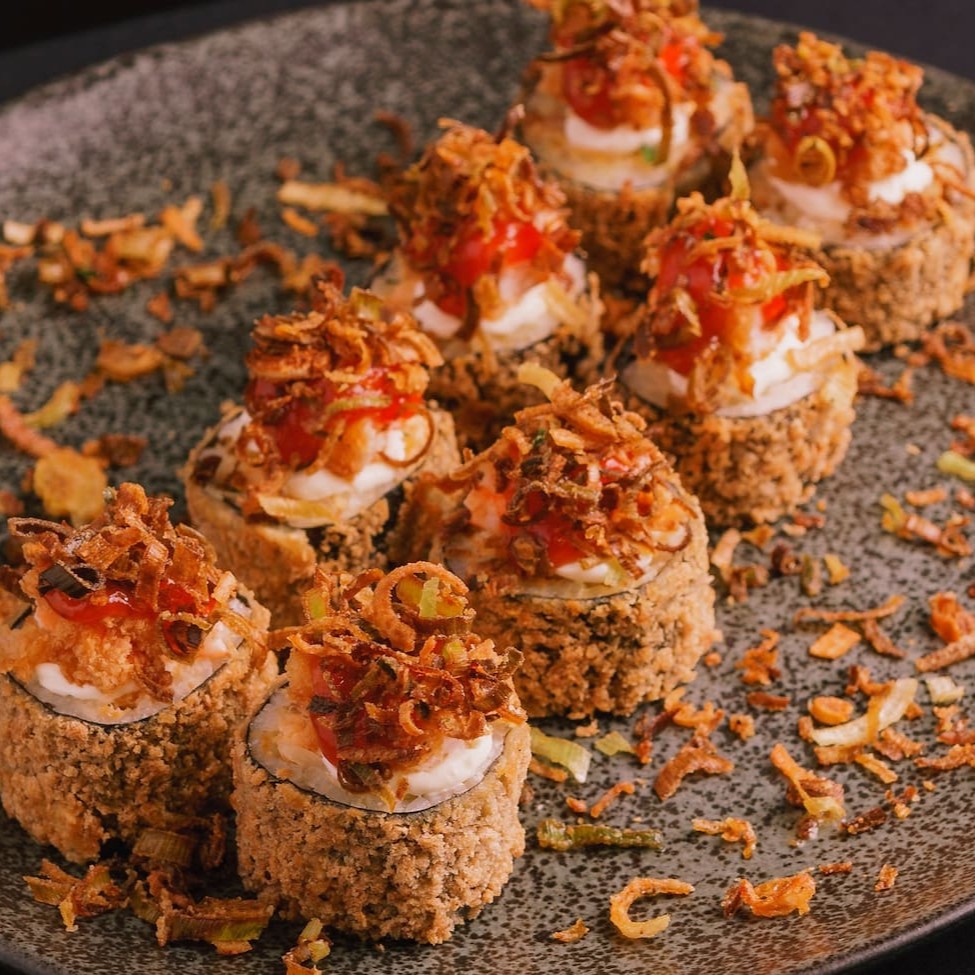 Enrolado de alga nori empanada na farinha de panko, recheado com salmão grelhado e cream cheese, coberto com crispy de couve caramelizado.