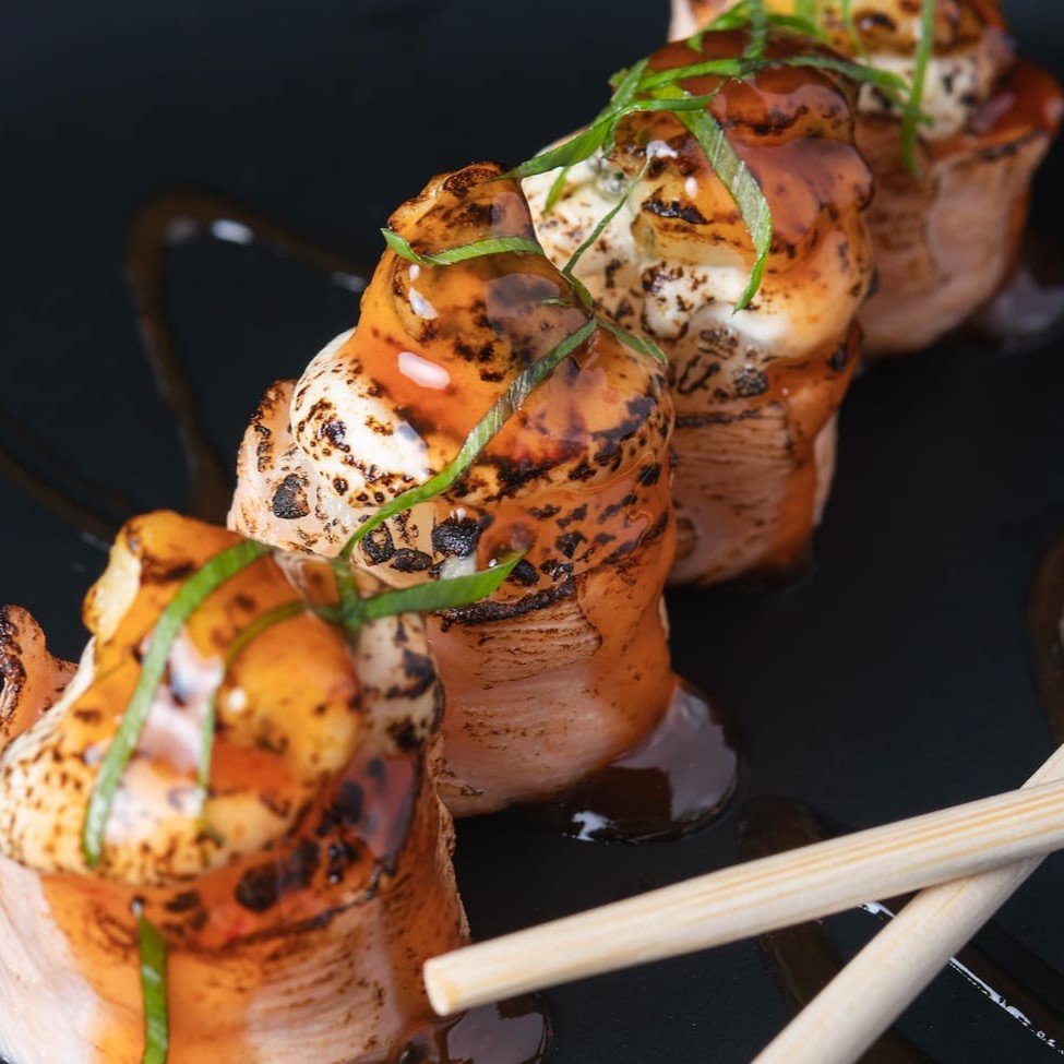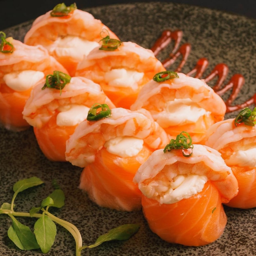 Camarão fresco envolto no salmão fresco com cream cheese, coberto com tataki de shimeji e cebolinha.