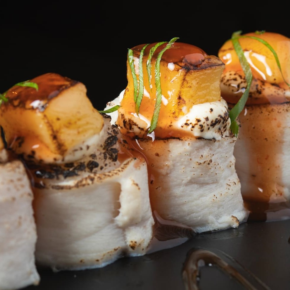Arroz gohan envolto na lâmina de peixe branco maçaricado, coberto com cream cheese, queijo brie maçaricado e geléia de rubras.