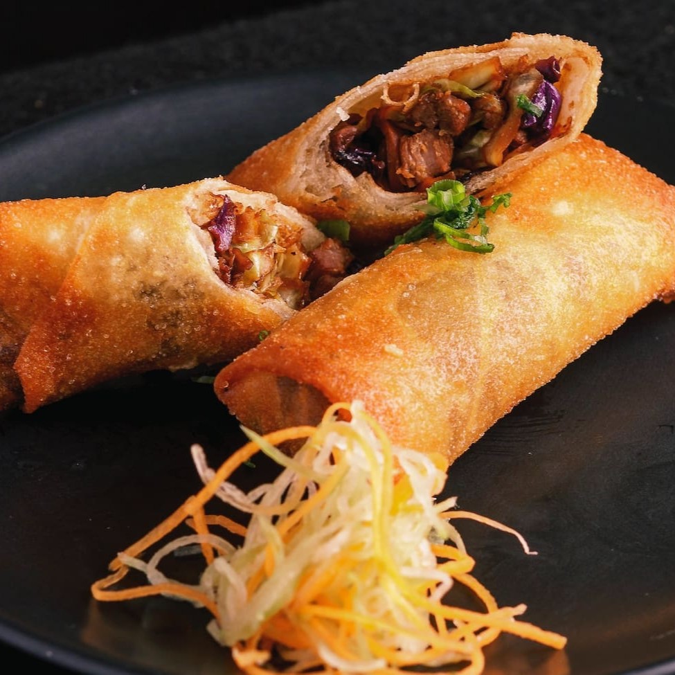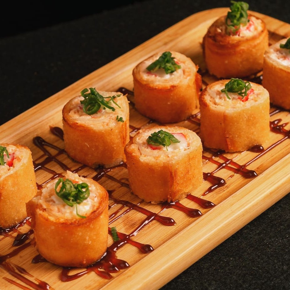 Massa de harumaki recheada com salmão, kani e cream cheese, coberta com molho teriyaki. (Acompanha: hashi, shoyu e teriaki)