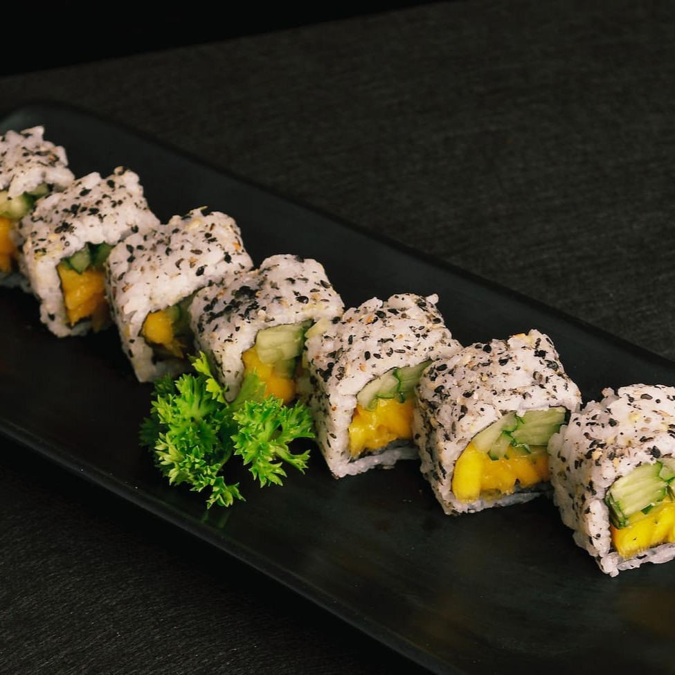 Uramaki com Kani, manga e pepino envoltos na alga nori com arroz gohan e gergelim.