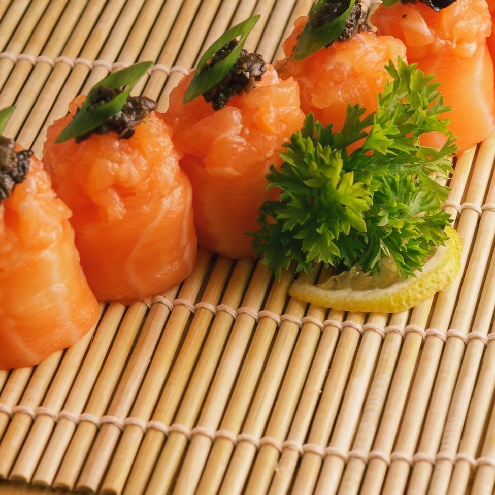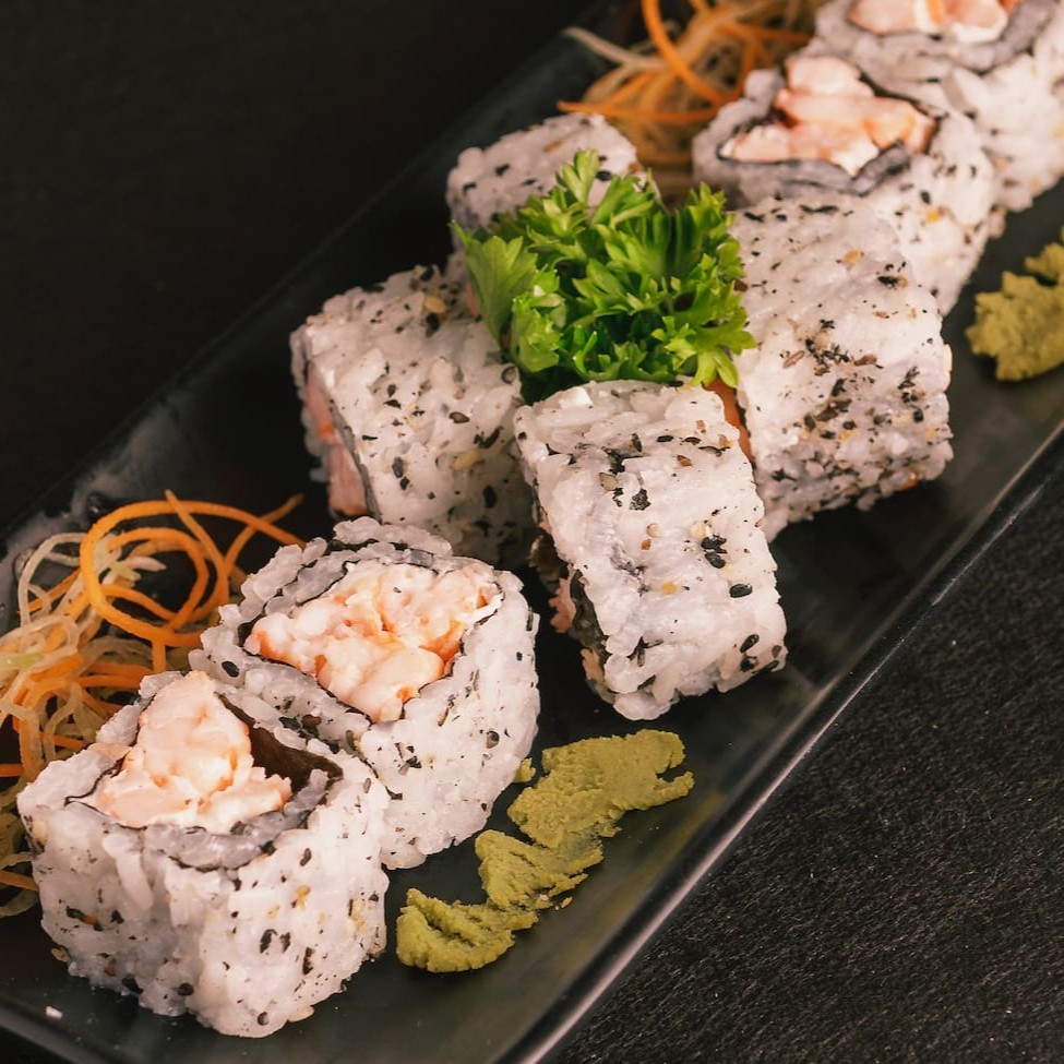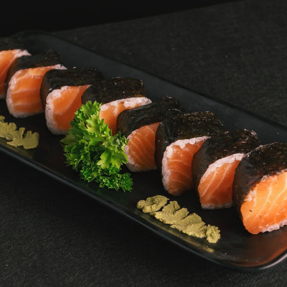 Salmão fresco enrolado na alga nori com arroz gohan e gergelim. (Acompanha: hashi, shoyu e teriaki)