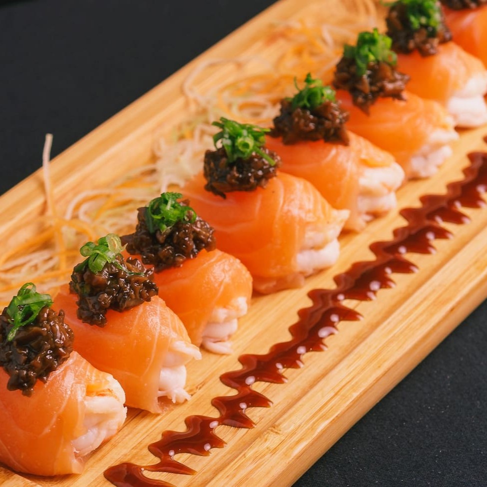 Arroz gohan envolto na lâmina de salmão, coberto com cream cheese, tataki de salmão fresco e trufas.