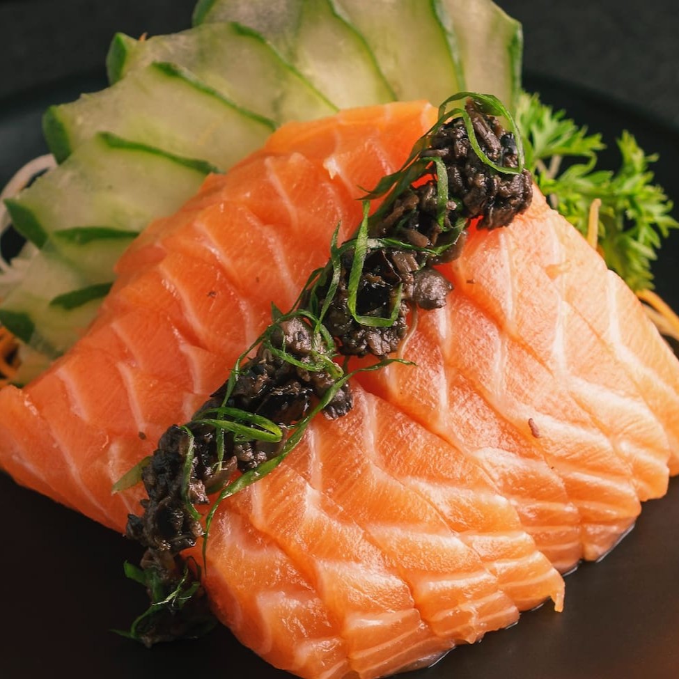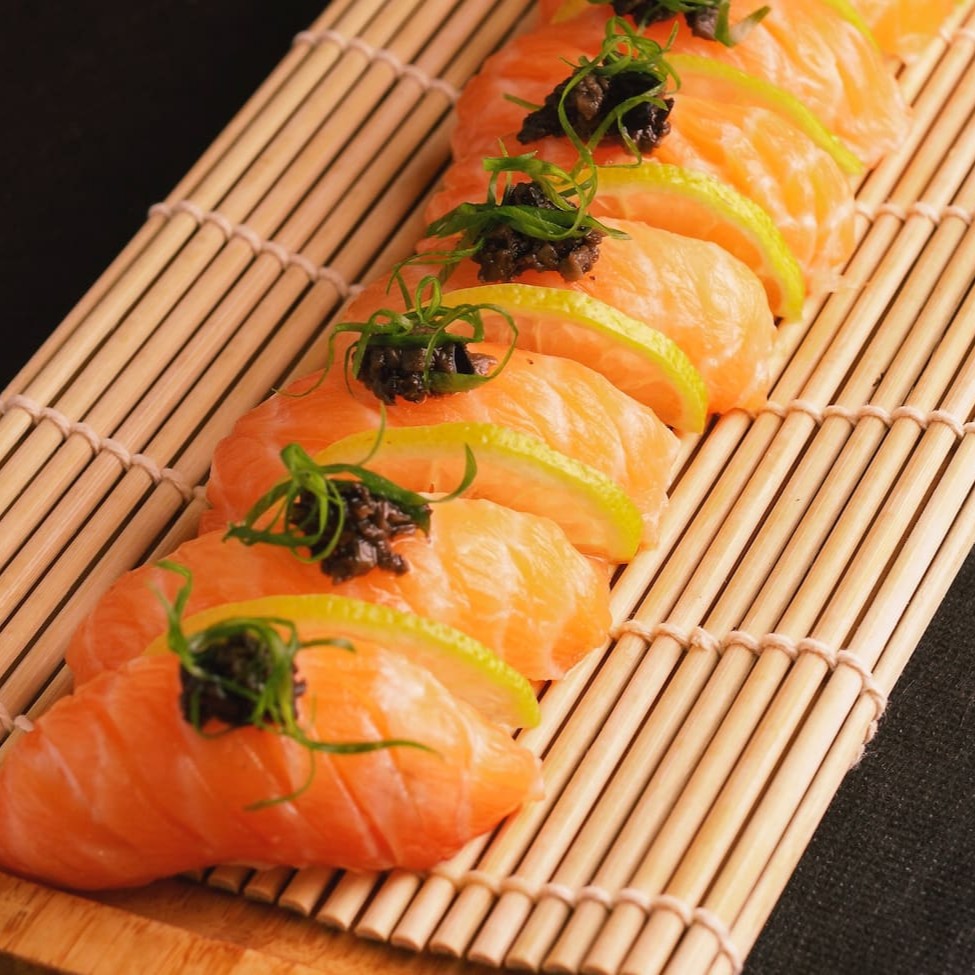 Lâminas de salmão fresco com trufas. (Acompanha: hashi, shoyu e teriaki)