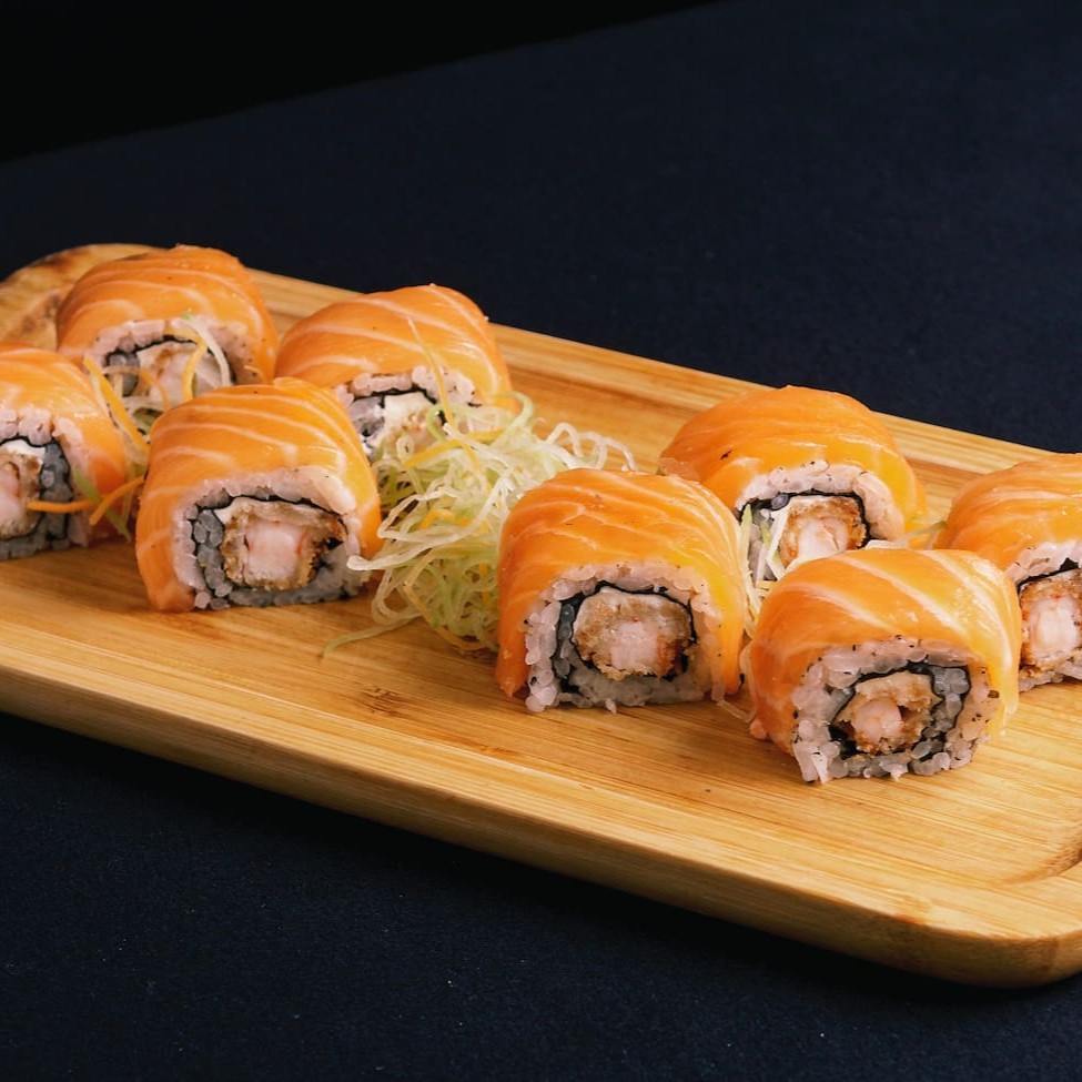 Arroz gohan envolto na lâmina de salmão fresco, coberto com cream cheese e camarão empanado.