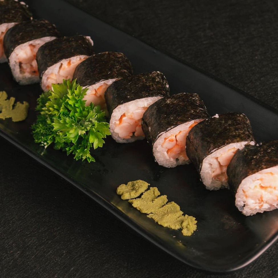 Camarão fresco com arroz gohan envoltos na alga nori. (Acompanha: hashi, shoyu e teriaki)
