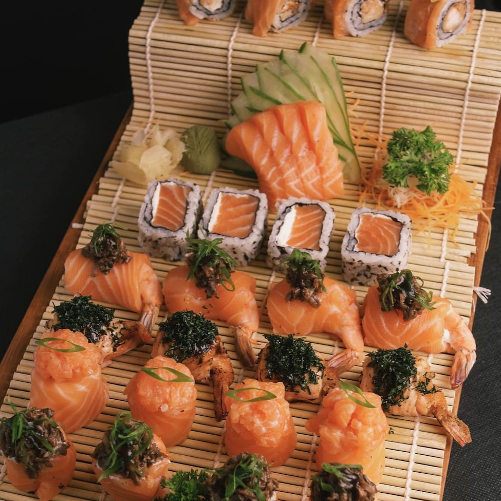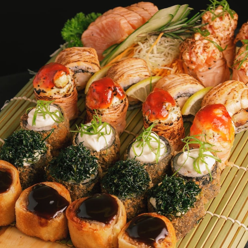 Combinado com 4 Hot roll, 4 Shake couve, 4 Hot Philadelphia, 4 Hot camarão, 4 Gunkan de gorgonzola, 4 Uramaki ebitem especial, 4 Sashimi de salmão. (Acompanha: hashi, shoyu e teriaki)