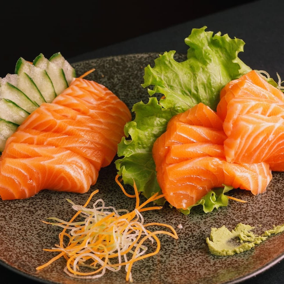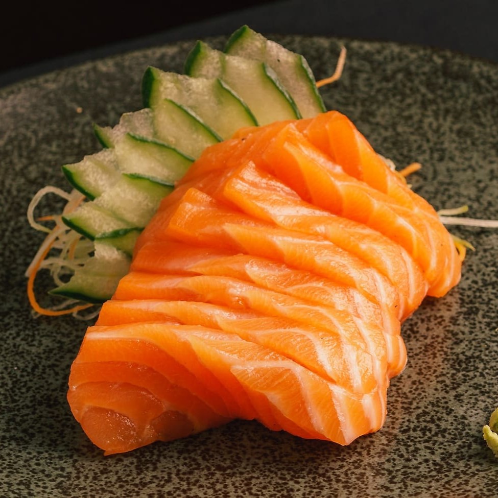 Lâminas de salmão fresco. (Acompanha: hashi, shoyu e teriaki)