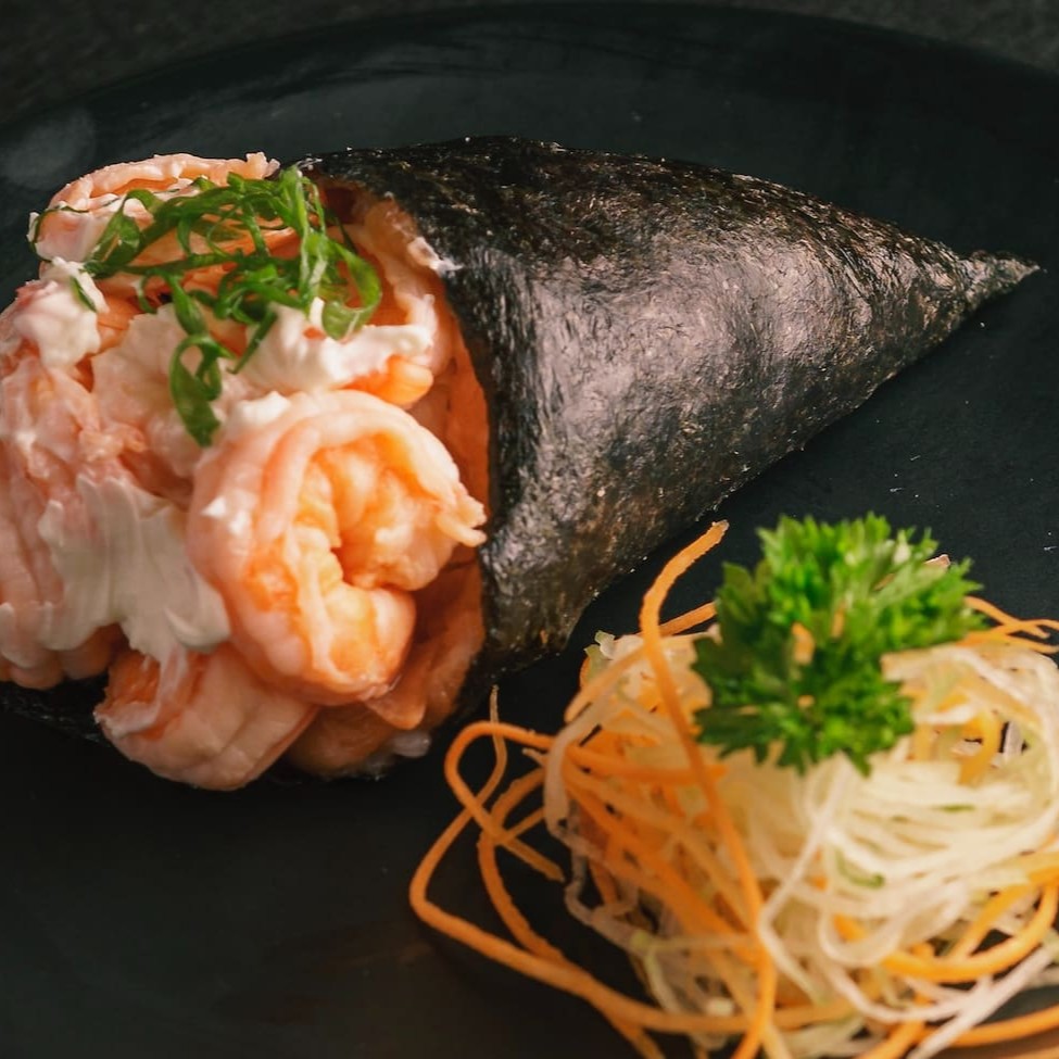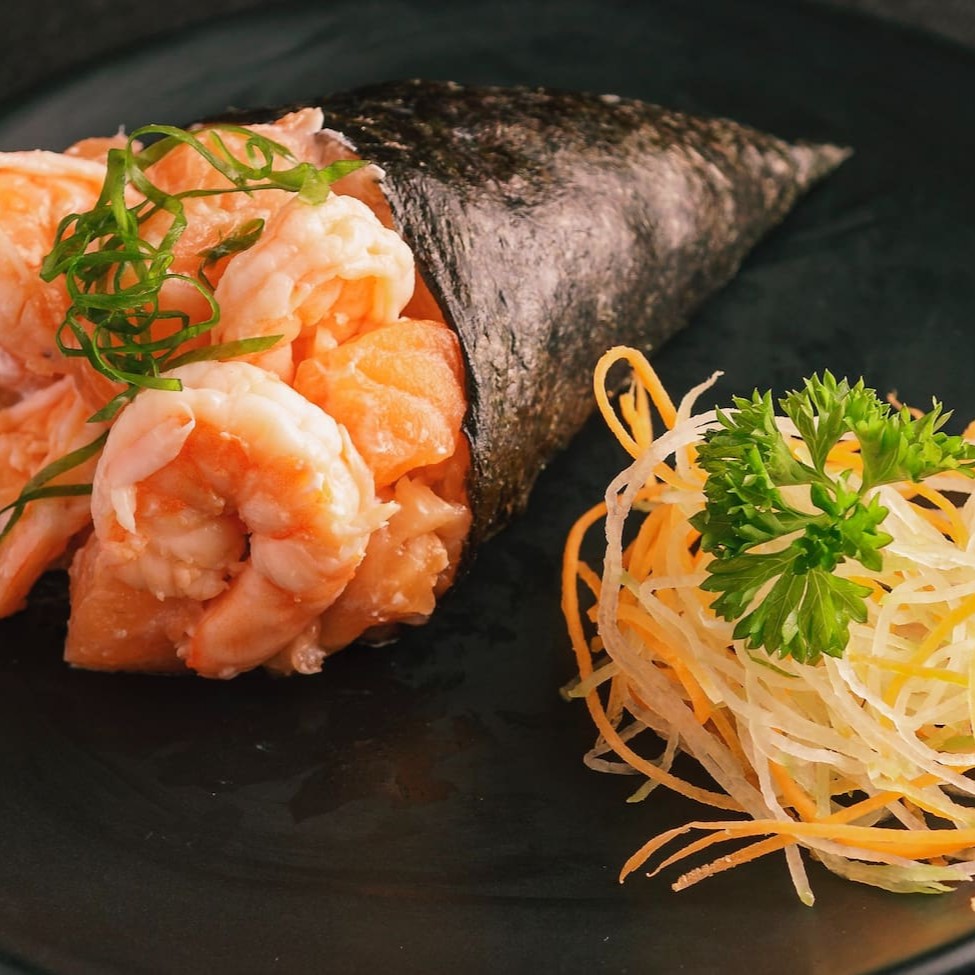 Arroz gohan, salmão e camarão frescos e cream cheese envoltos na alga nori, em forma de cone. (Acompanha: hashi, shoyu e teriaki)