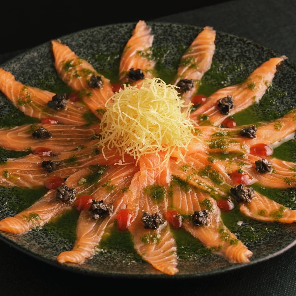 Lâminas de salmão fresco com trufas, cobertas com molho de ervas da casa e geléia de rubras, temperadas com flor de sal. Acompanha crispy de batata doce.