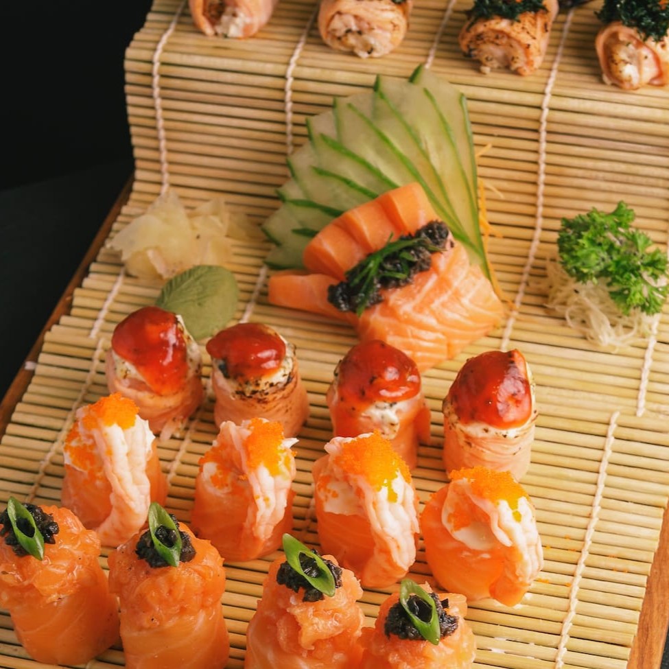 Arroz gohan envolto na lâmina de salmão fresco, coberto com cream cheese, camarão, geléia de rubras e cebolinha.