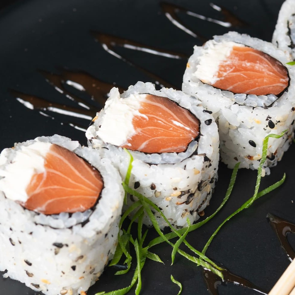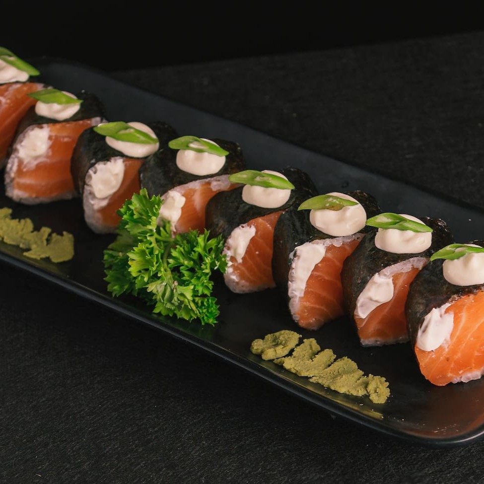 Salmão fresco, cream cheese e arroz gohan envoltos na alga nori (Acompanha: hashi, shoyu e teriaki)