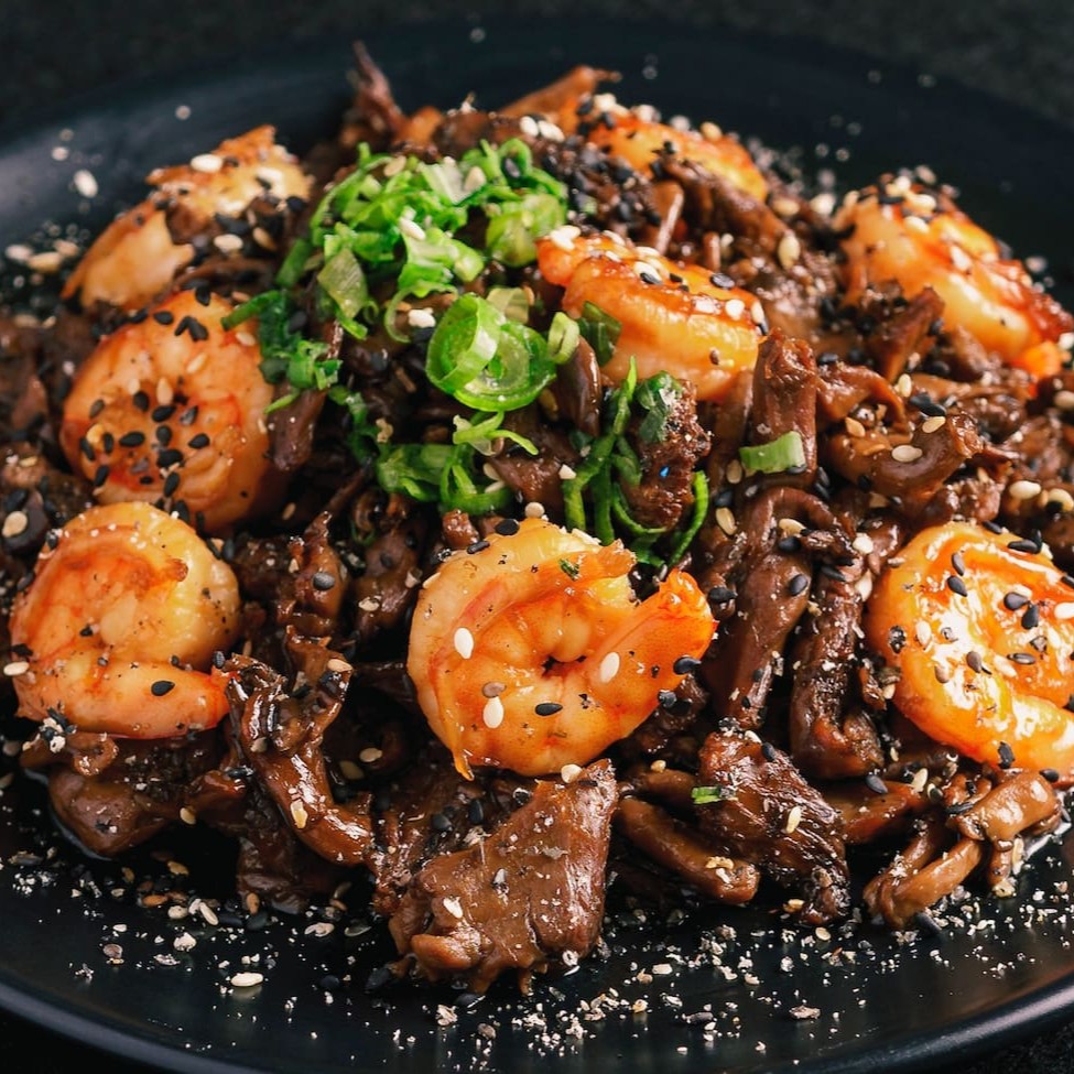 Cogumelos e camarões refogados na manteiga com temperos especiais e gergelim. (300g)