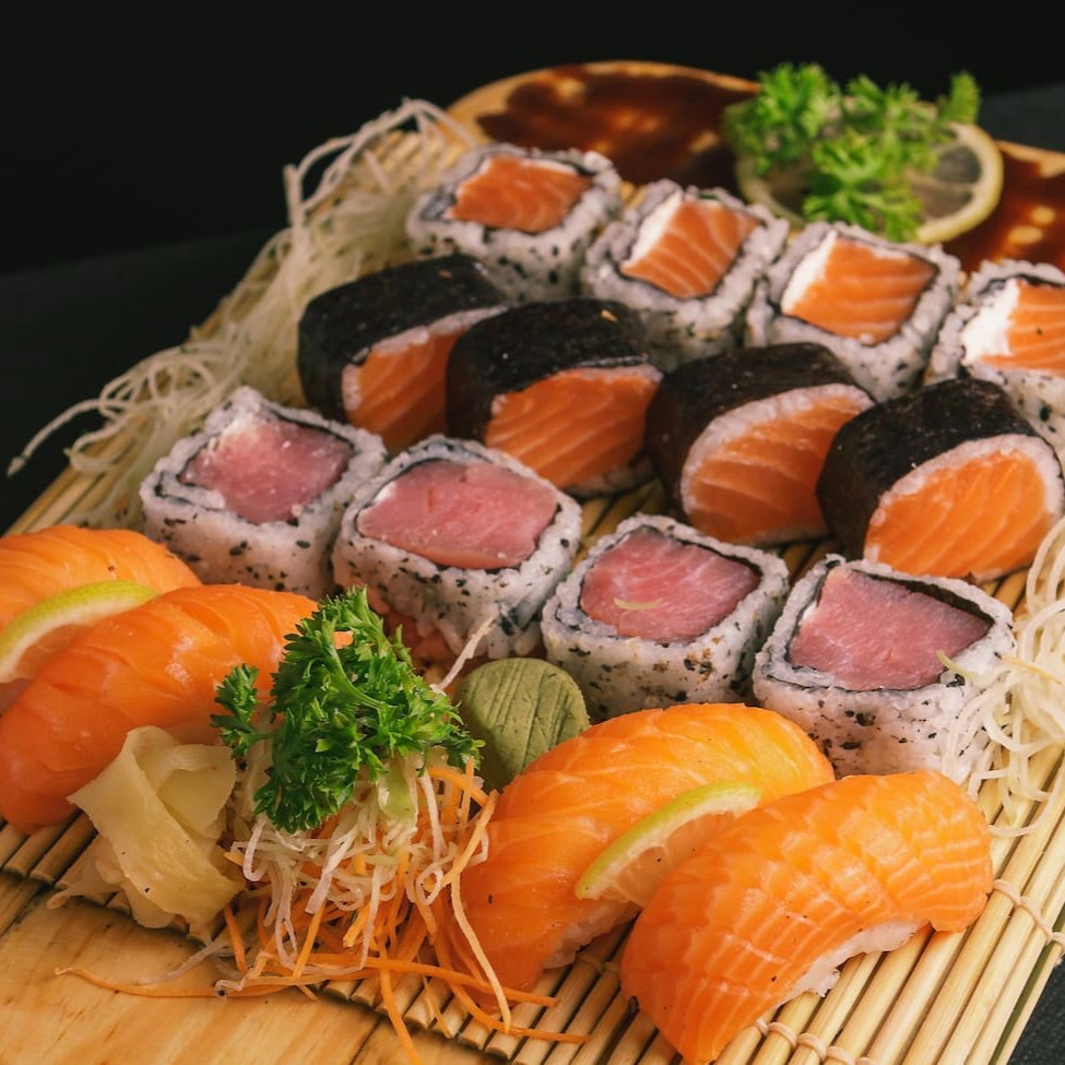 4 Uramaki Philadelphia, 4 Uramaki atum, 4 Hossomaki salmão, 4 Niguiri salmão, 4 Sashimi salmão, 4 Sashimi atum. (Acompanha: hashi, shoyu e teriaki)