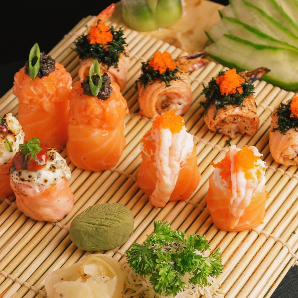 Arroz gohan envolto na lâmina de salmão fresco, coberto com cream cheese, tataki de skin e molho de maracujá.