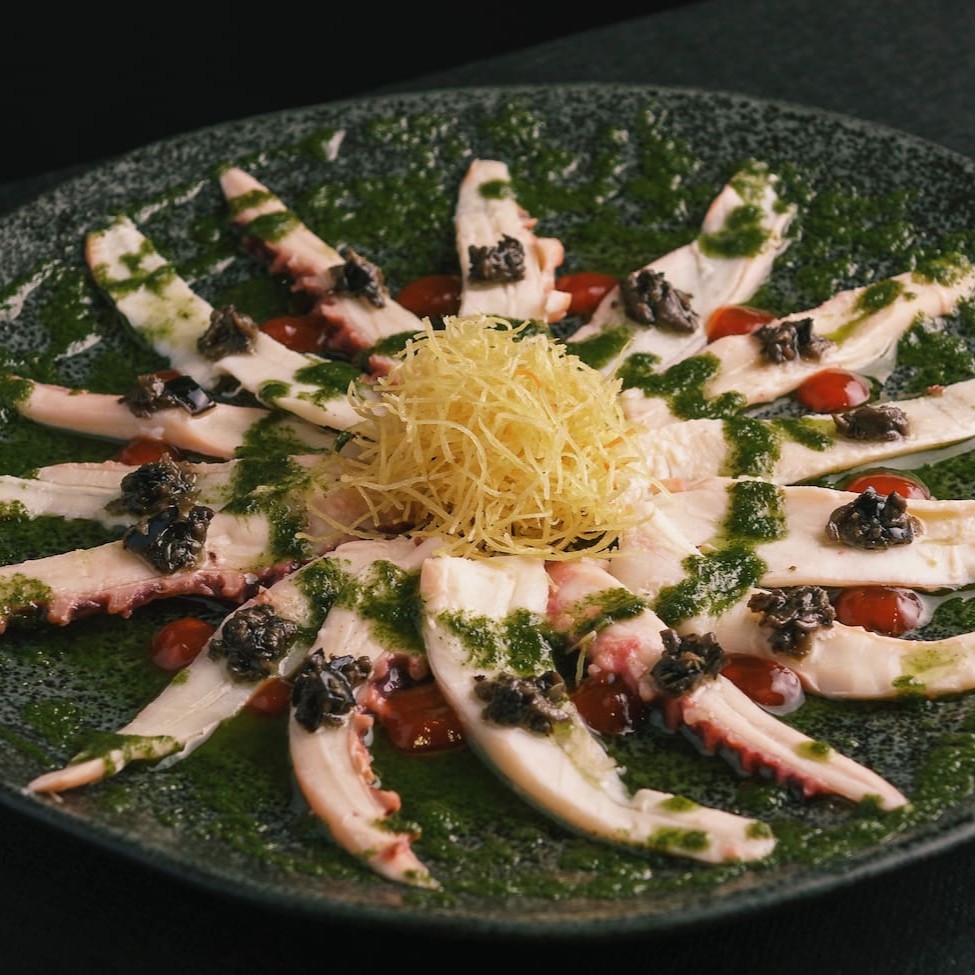 Lâminas de tentáculos de polvo, cobertas com molho de ervas da casa, trufas e geléia de rubras, temperadas com flor de sal. Acompanha crispy de batata doce.