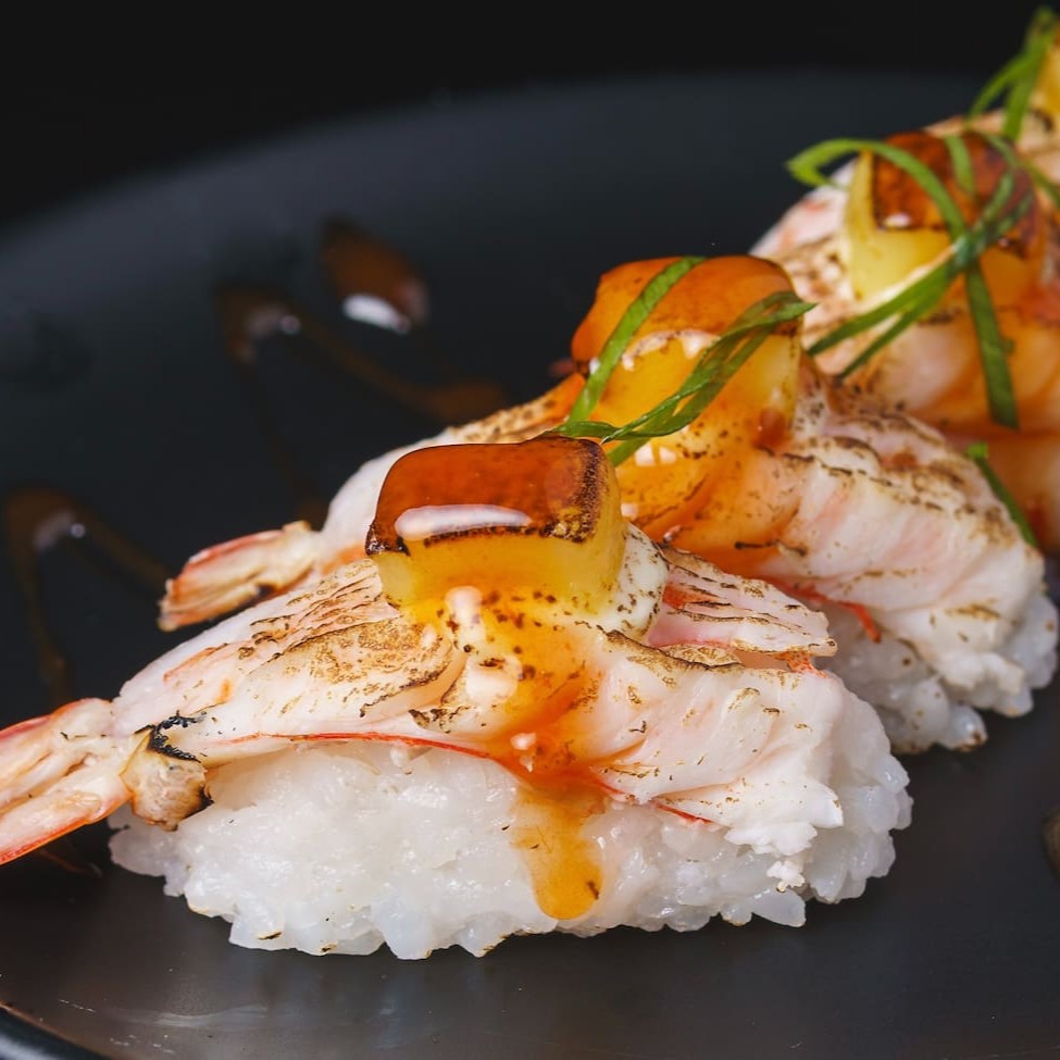 Niguiri com Lâminas de camarão e peixe brie maçaricados, coberto com geleia de rubras sob o arroz gohan.