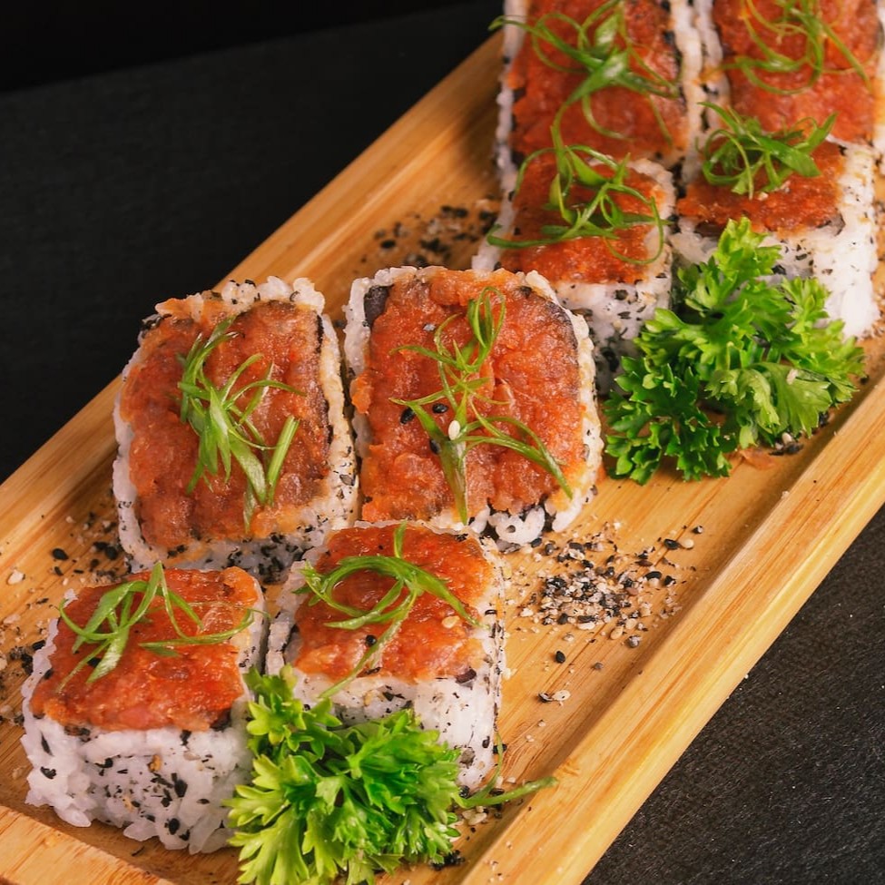 Atum com molho spicy (levemente picante) enrolados na alga nori com arroz gohan e gergelim.