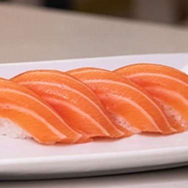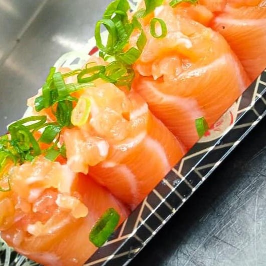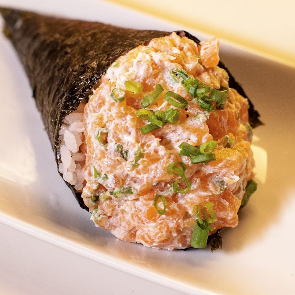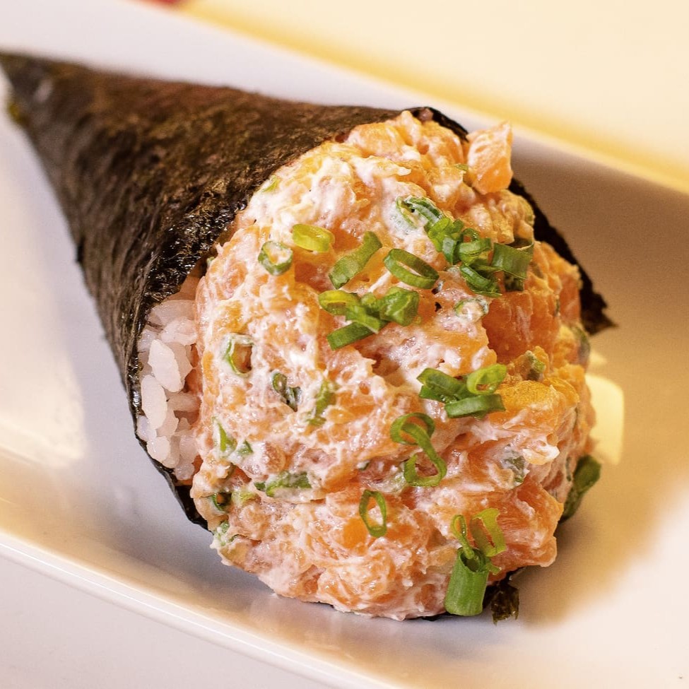 Arroz japonês envolto na fatia de salmão fresco, tartar de salmão fresco, cream cheese, cebolinha e mix de gergelim moído. Acompanha shoyu, gengibre em conserva e wasabi.