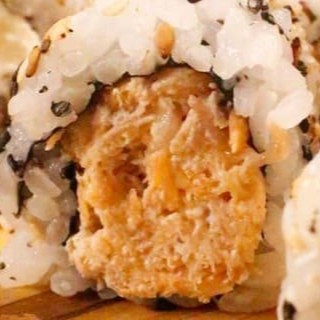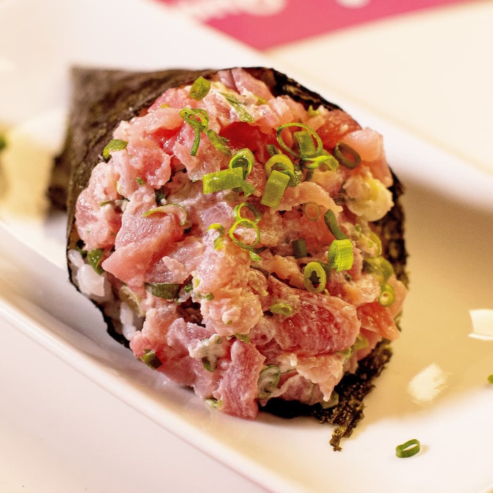 Enrolado com arroz japonês, alga nori e mix de gergelim, recheado com atum fresco e cream cheese, acompanhado por shoyu, gengibre em conserva e wasabi.