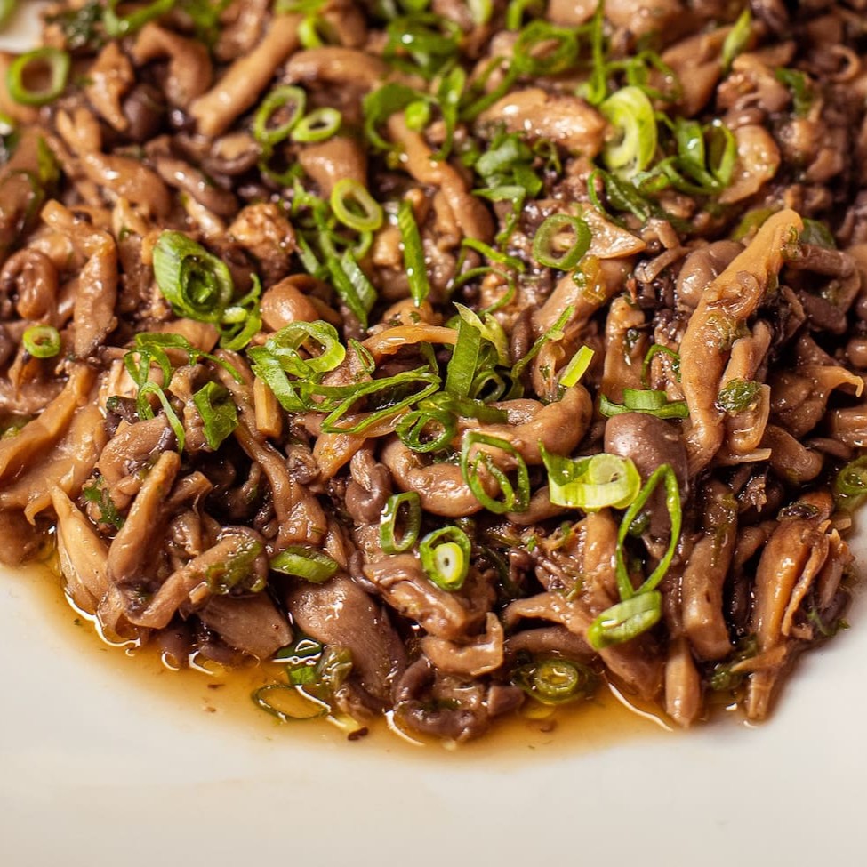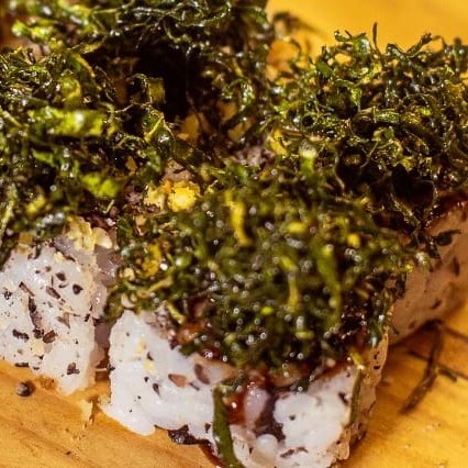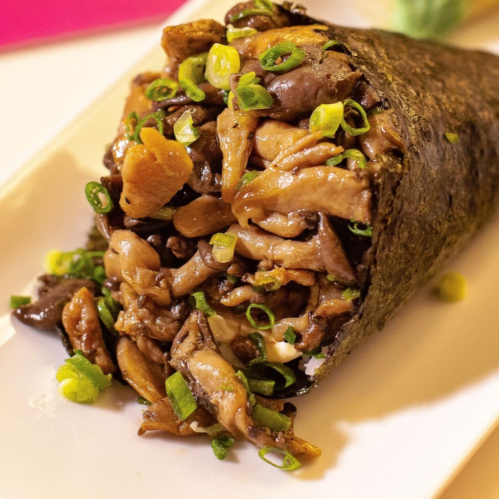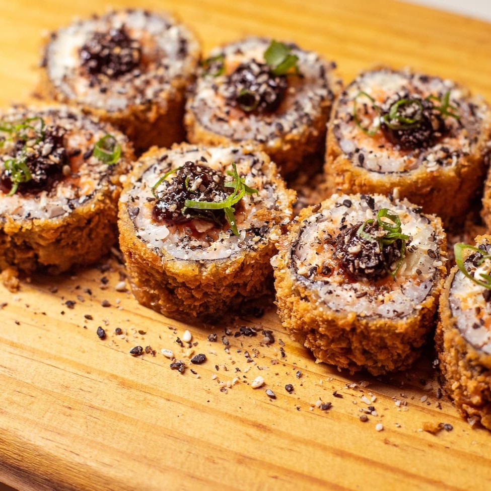 Arroz japonês, alga nori e mix de gergelim empanados, recheado com shimeji fresco salteado e cream cheese, finalizado com molho Outside e cebolinha. Acompanha shoyu, gengibre em conserva e wasabi. Veggie