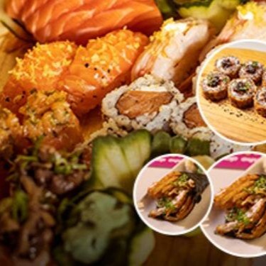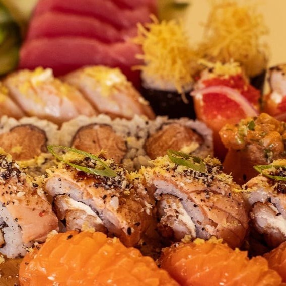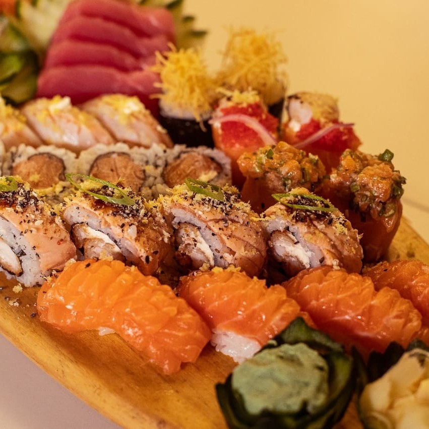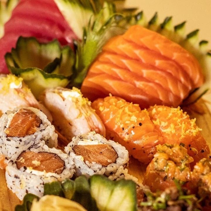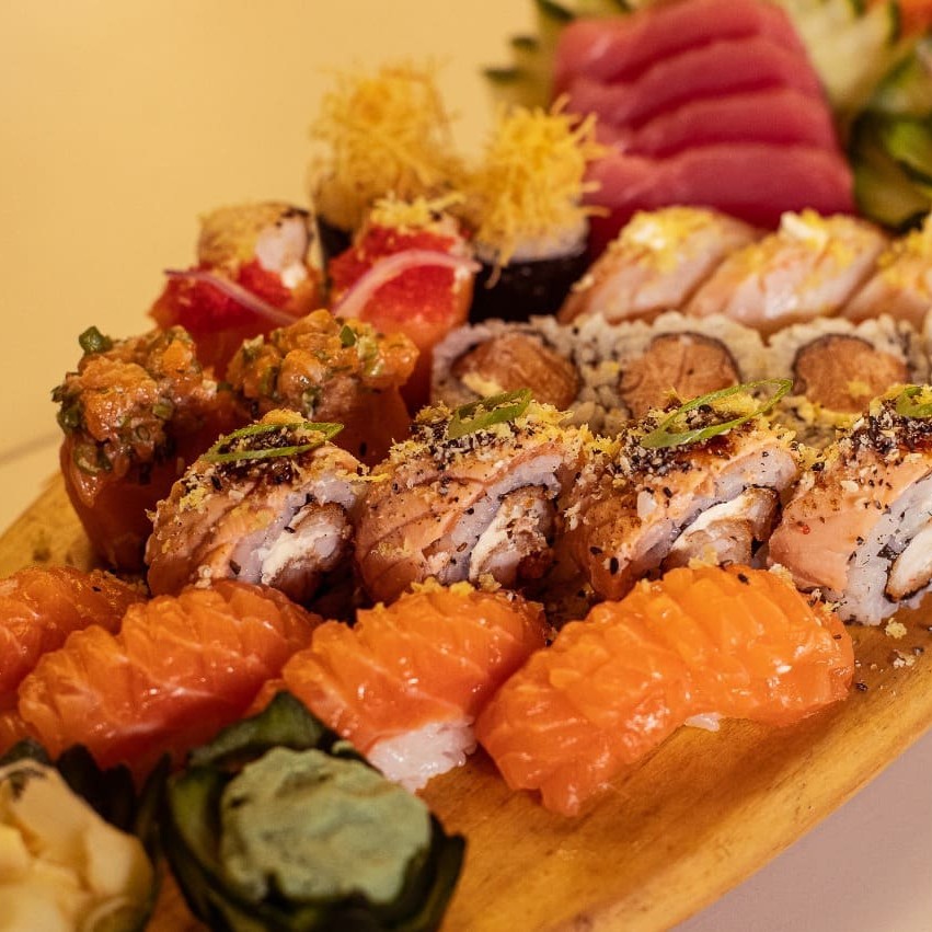 3 Sashimis de salmão fresco, 3 Sashimis de atum fresco, 3 Sashimis de peixe branco fresco, 3 Niguiris de salmão fresco, 4 Niguiris de camarão trufado, 2 Dyos de salmão, 2 Dyos de vieira, 4 Uramakis de salmão fresco com cream cheese, 4 Uramakis Ebi Especial, 2 Shake Maki com crispy de batata doce.