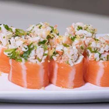 Arroz japonês envolto na lâmina de salmão fresco, vieira levemente maçaricada, cream cheese, picles de cebola roxa, ovas de massago e raspas de limão siciliano. Acompanha shoyu, gengibre em conserva e wasabi.