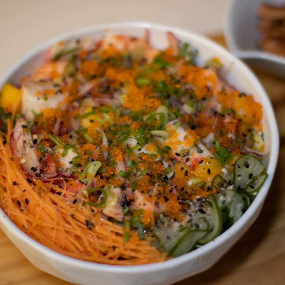 Vieira e salmão frescos, camarão cozido, kani, manga, tomate uva, cebola roxa, cebolinha e mix de gergelim, marinados com azeite trufado, raspas de limão siciliano e flor de sal, acompanhado com pepino japonês, finalizado com ovas de massago e palha de batata doce.
