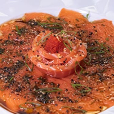 Finas lâminas de salmão fresco com azeite trufado, raspas de limão siciliano, molho especial da casa, mix de gergelim moído e palha de batata doce.