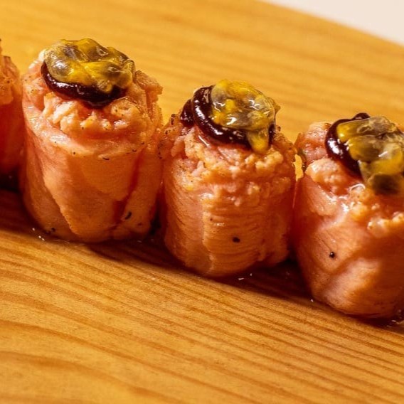 Arroz japonês envolto na lâmina de salmão fresco levemente maçaricada, maracujá, cream cheese e molho Outside. Acompanha shoyu, gengibre em conserva e wasabi.