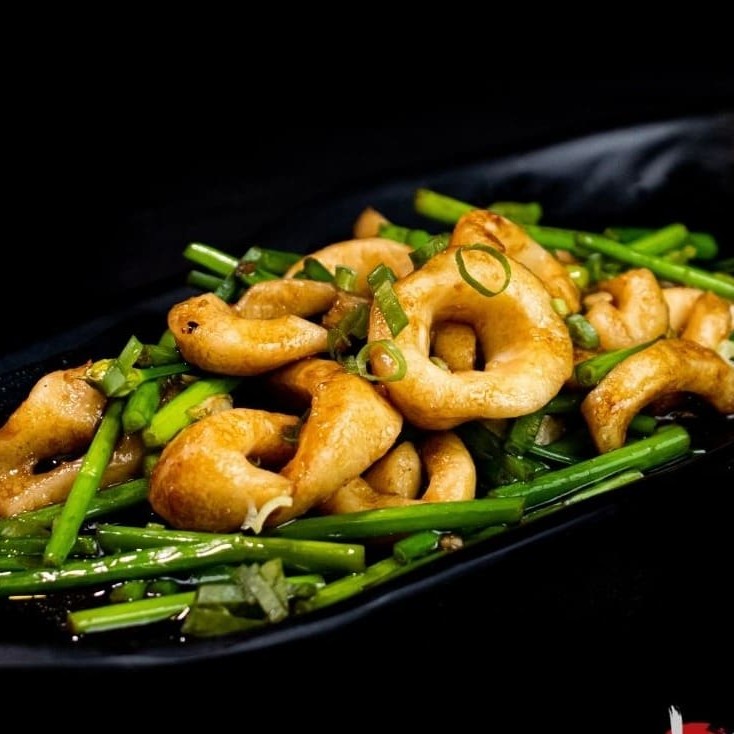 Broto de alho com anéis de lula ou camarão ao molho Tonkatsu. A escolha é sua! Incluso: (01 Hashi)