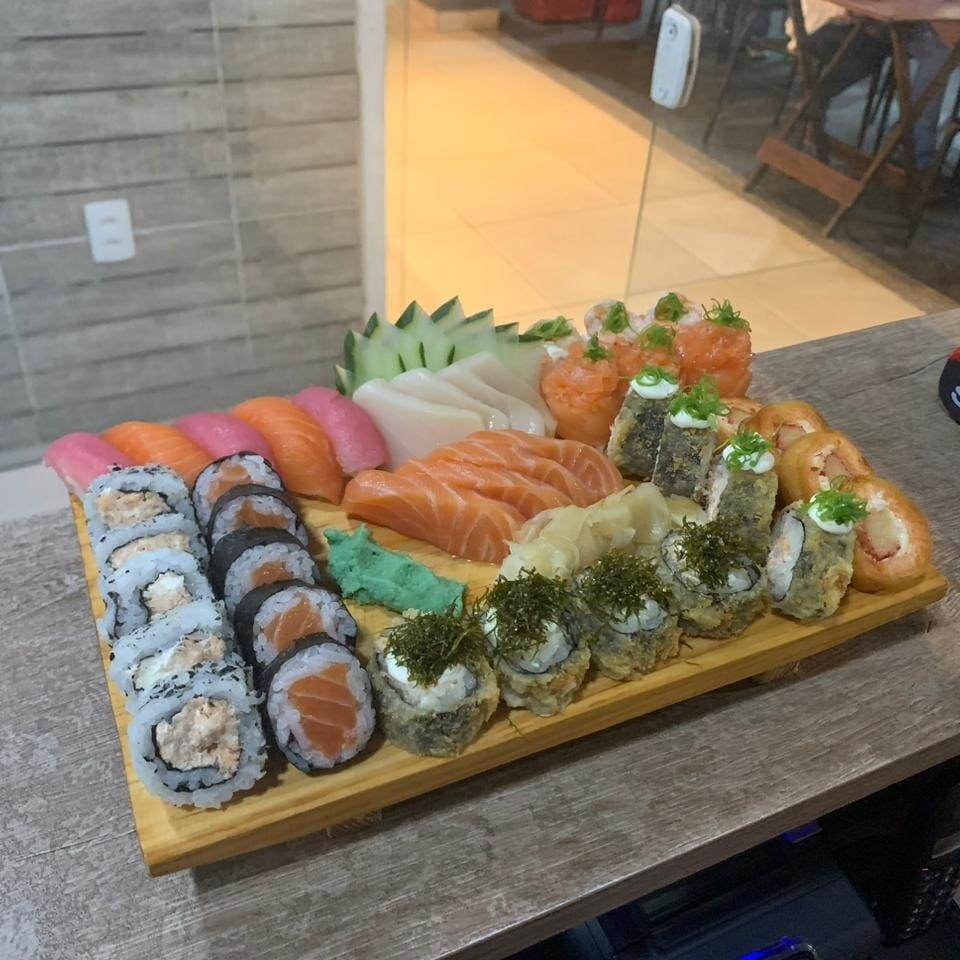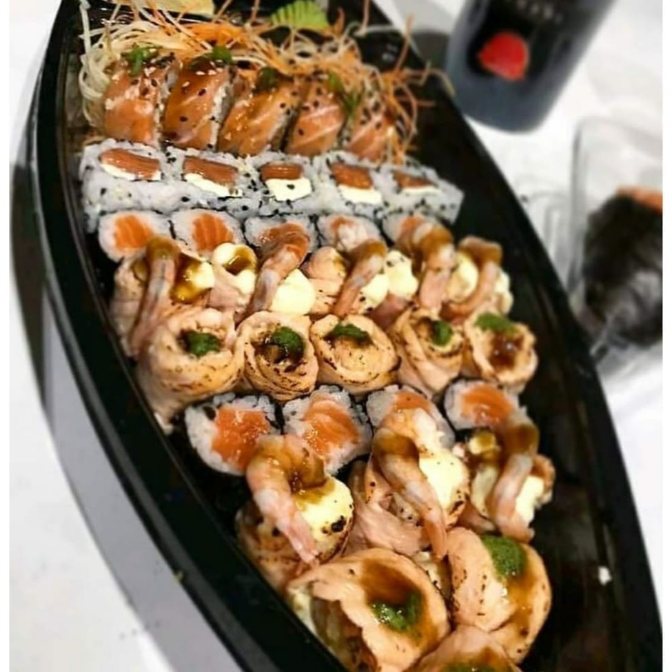 Uma seleção das melhores peças da nossa loja. ( 06 uramaki Especial com camarão 06 uramaki filadélfia 06 Dyo Camarão maçaricado 06 Hossomaki Salmão 06 Kenpari Rolls Camarão e Creme