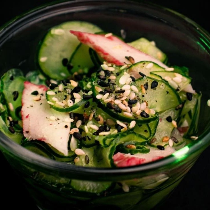 Saladinha Refrescante de Pepino japonês em conserva com kani e gergelim.