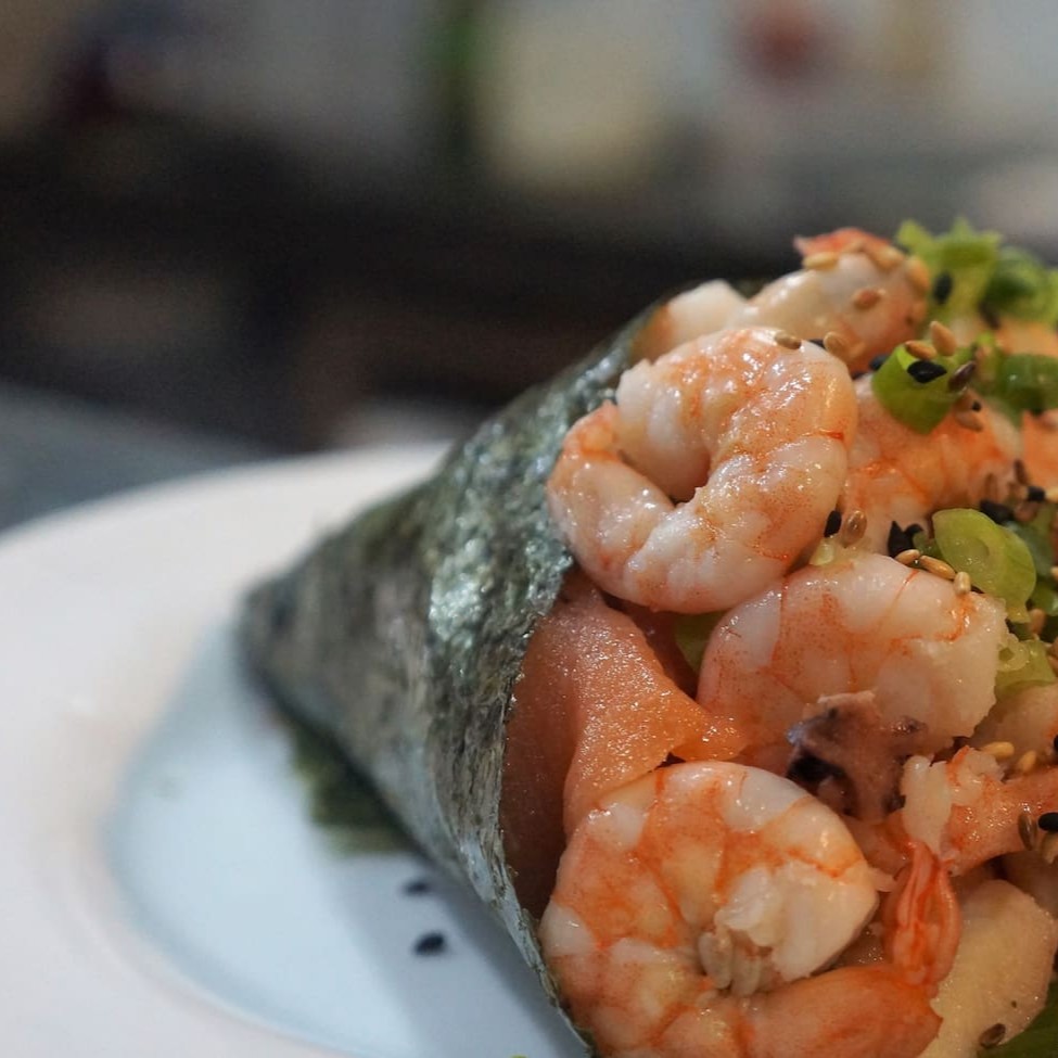 Melhor Dupla! Temaki Salmão fresco cortado em cubos, Camarão Pré Cozido com Cream Cheese e cebolinha. (com arroz)