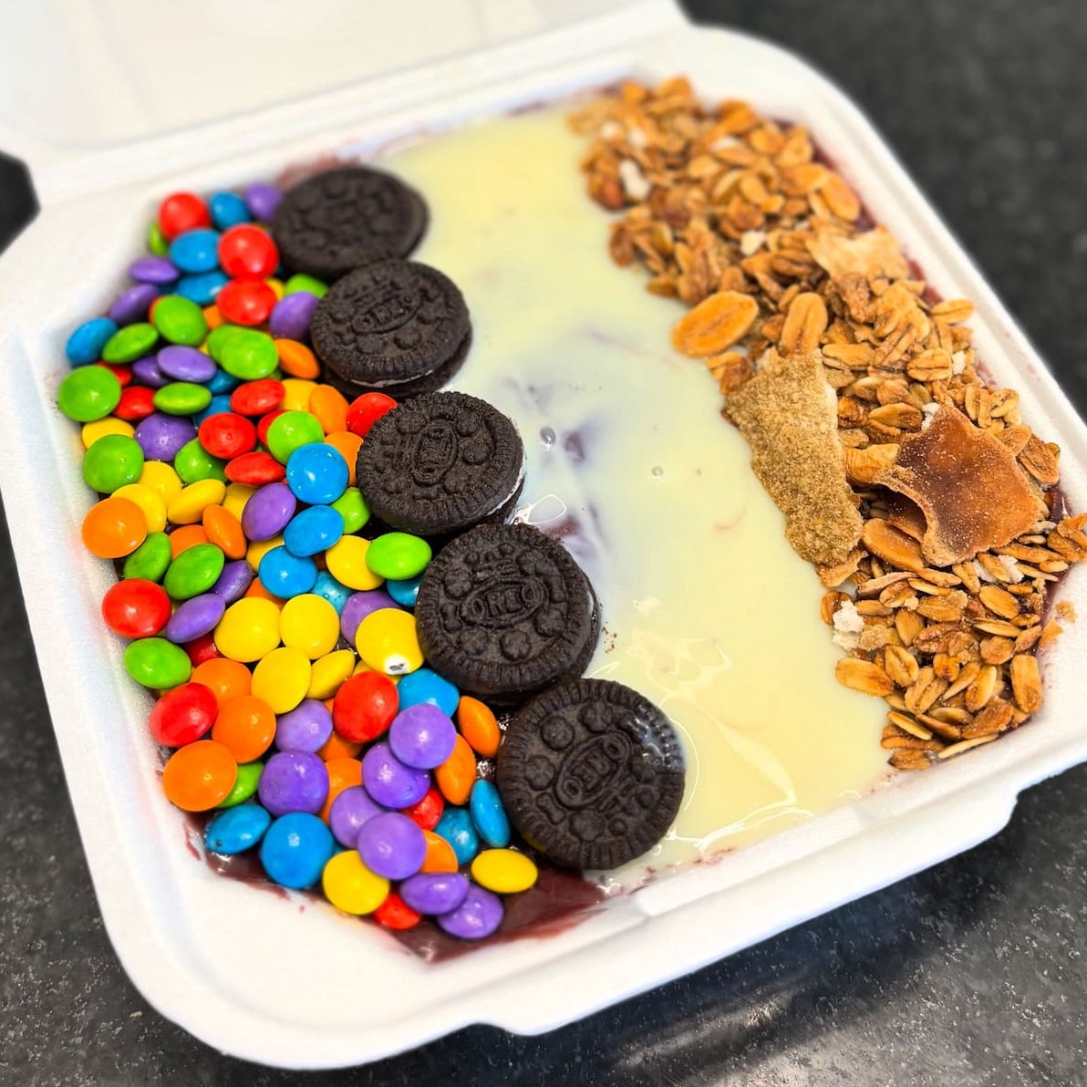 Meio litro de açaí na marmita, complementos no capricho.