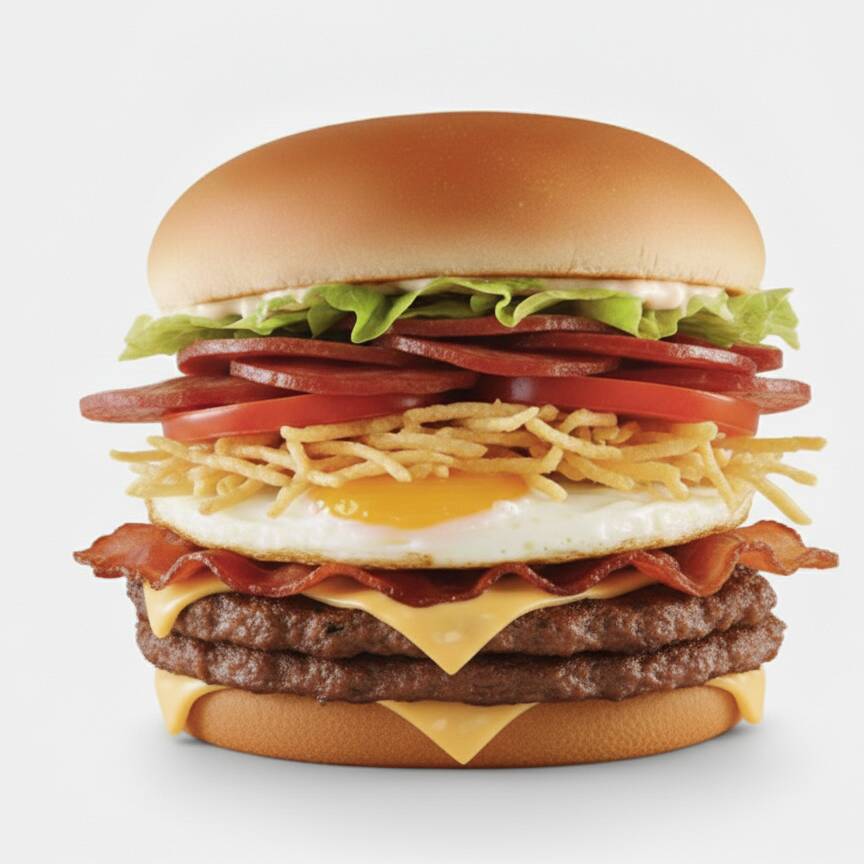 Pão, 2 carnes, ovo, 2 queijos, presunto, alface, tomate, batata palha e 2 molhos especiais.