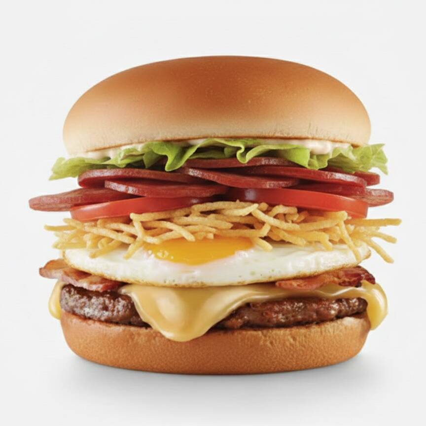 Pão, carne, ovo, queijo, presunto, alface, tomate, batata palha e molho especial.