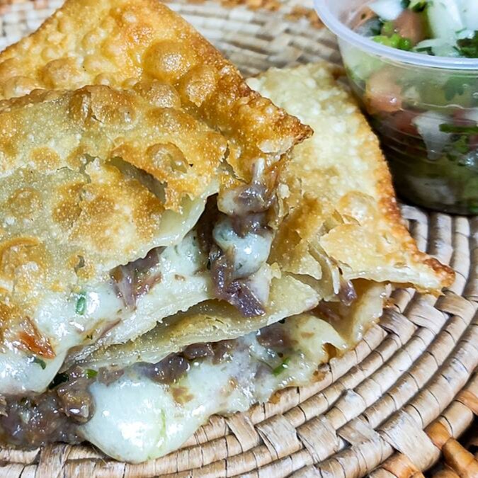 Pastel crocante por fora, e suculento por dentro. Recheado com Charque macio e Catupiry. Uma delícia!