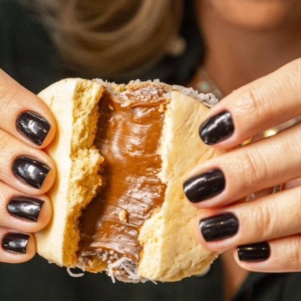 Alfajor de chocolate com recheio de doce de leite e cobertura de chocolate meio amargo.