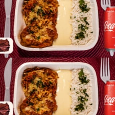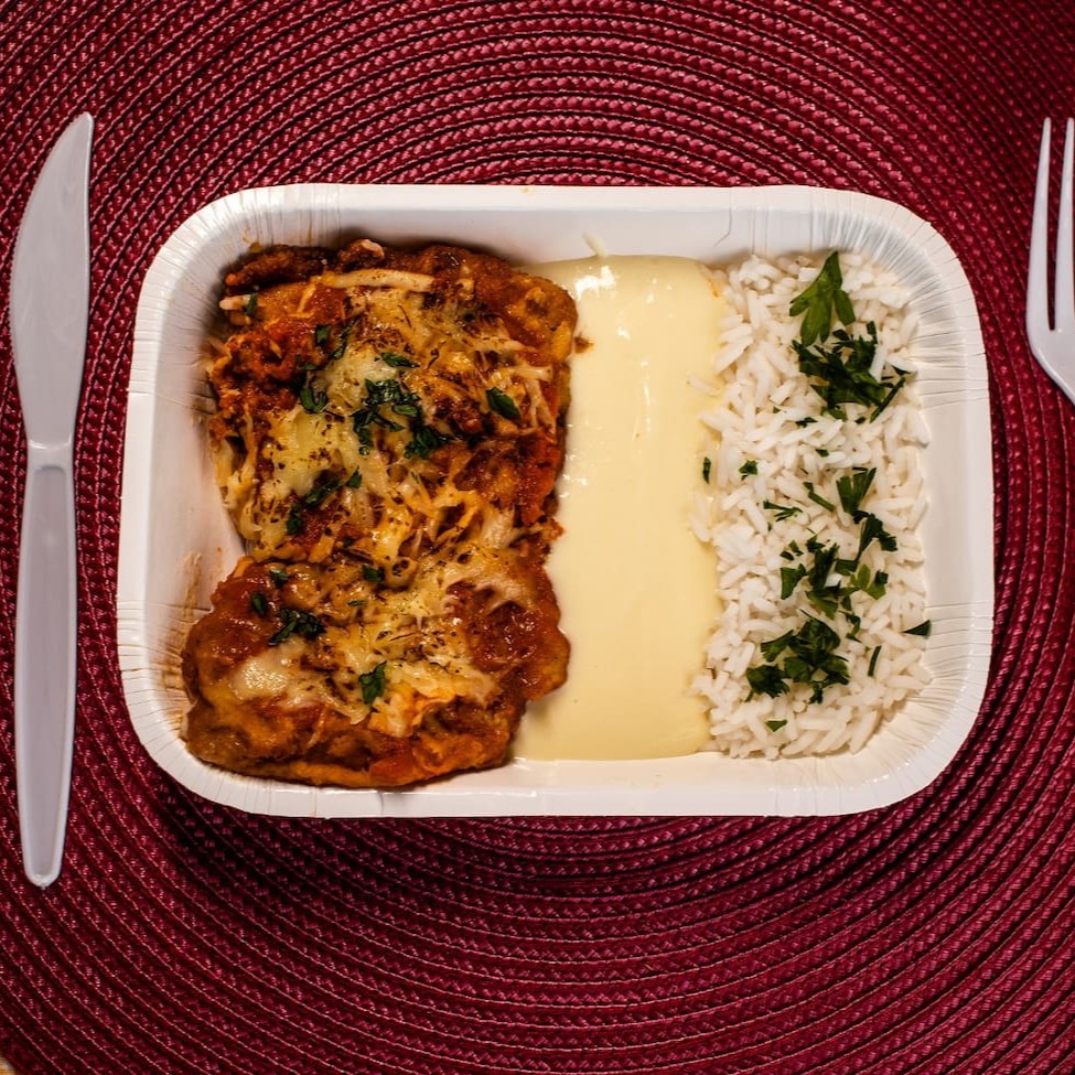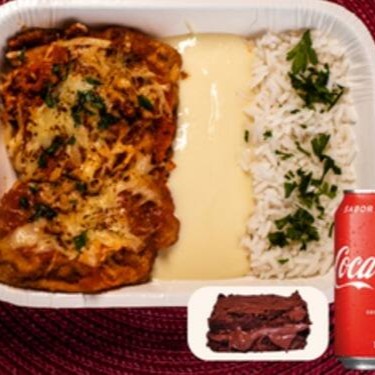 1 Parmegiana artesanal, acompanhada de arroz soltinho e purê de batata cremoso, com 1 refrigerante lata (350ml) e 1 sobremesa para adoçar o momento.