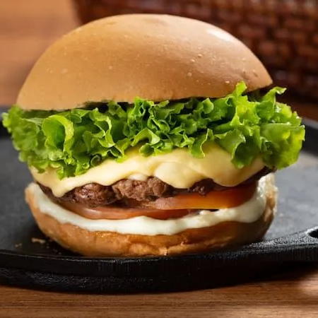 Pão, carne, queijo e salada. Acompanha maionese temperada e ketchup