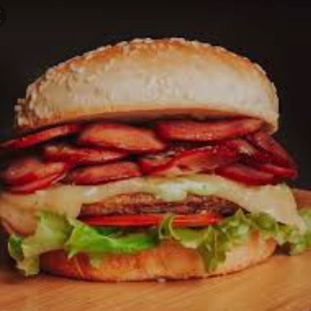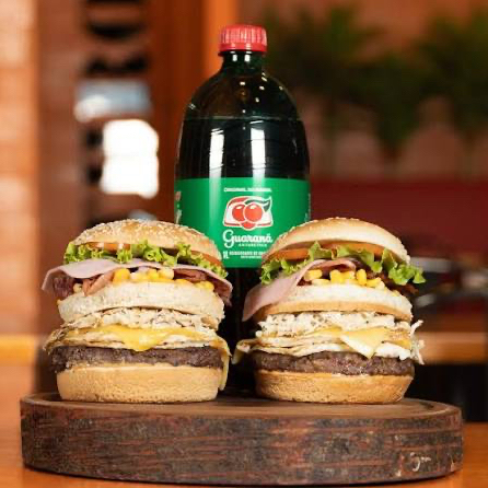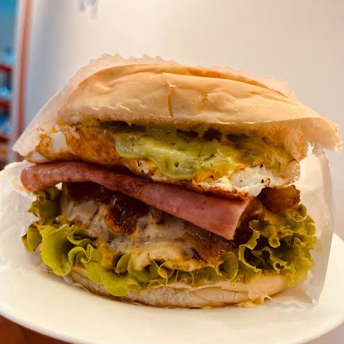 Pão, carne, queijo, bacon, ovo e salada. Acompanha maionese temperada e ketchup