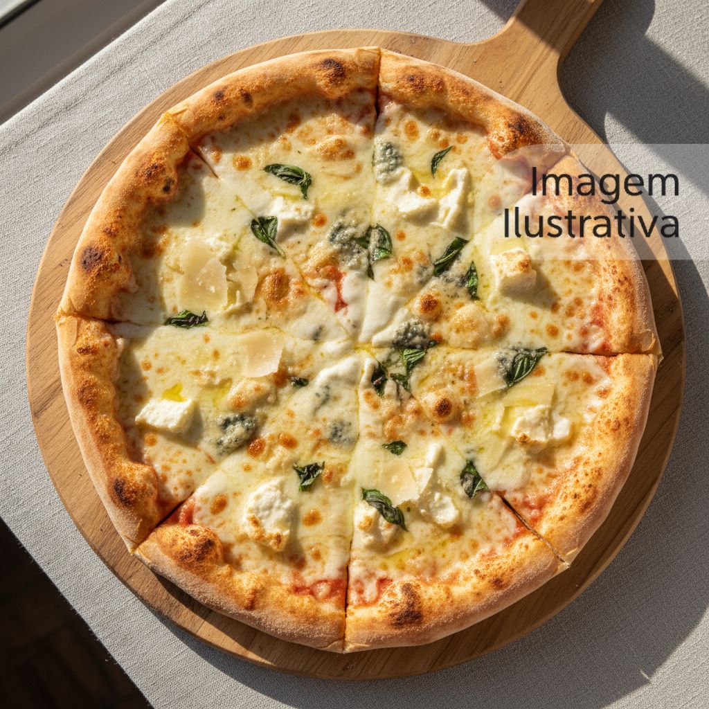 Pizza artesanal com 6 fatias, molho de tomate, presunto, bacon, Catupiry, azeitona e finalizada com orégano.