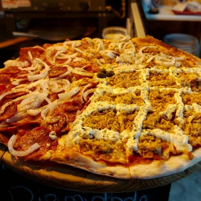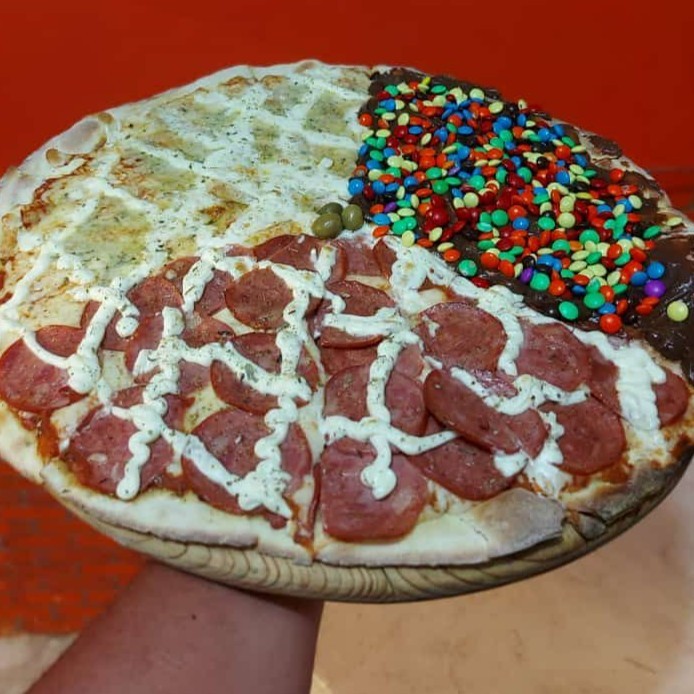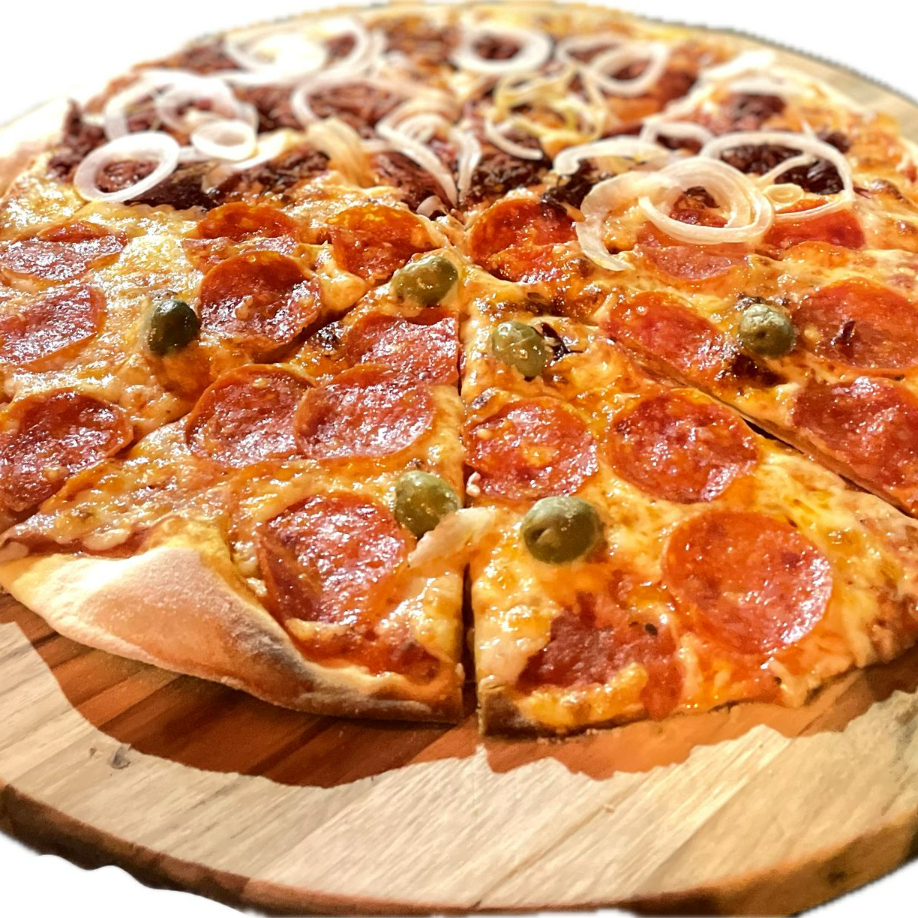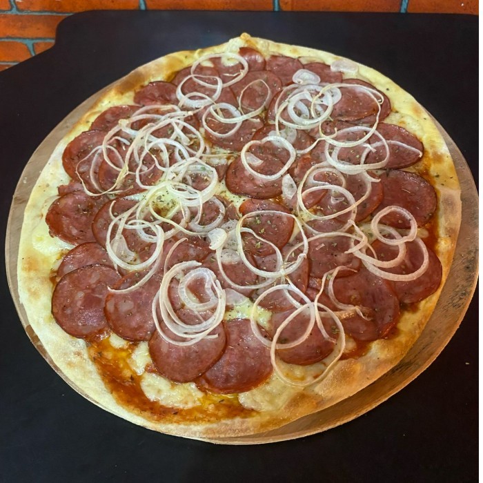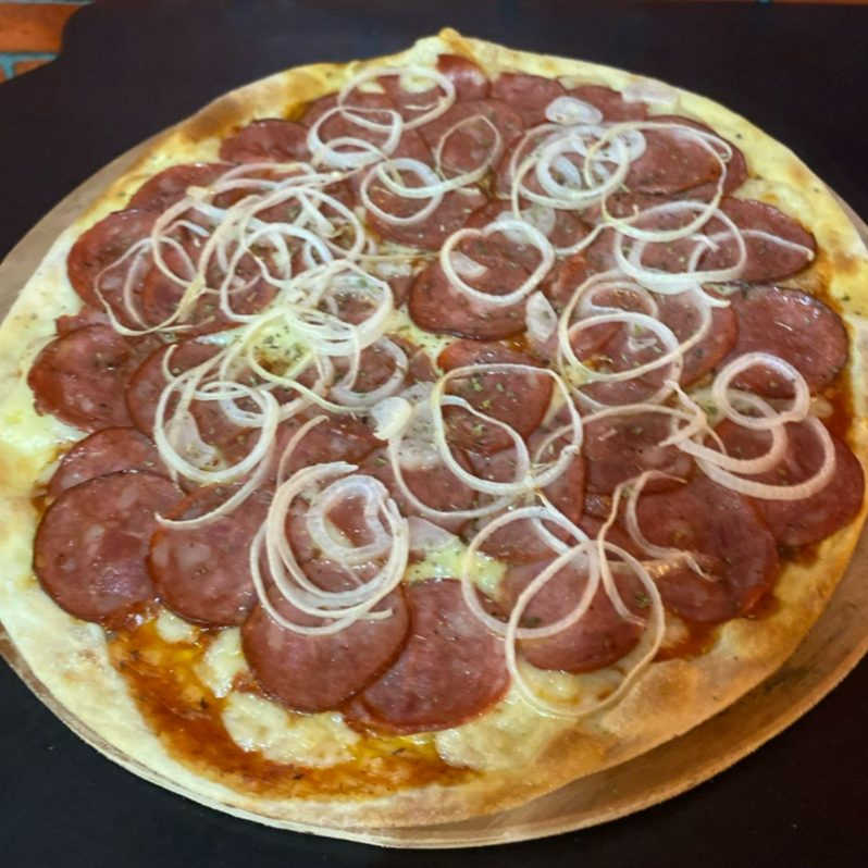 Massa Artesanal, Molho, Muçarela, Calabresa, Peperoni e finalizado com pimenta calabresa.