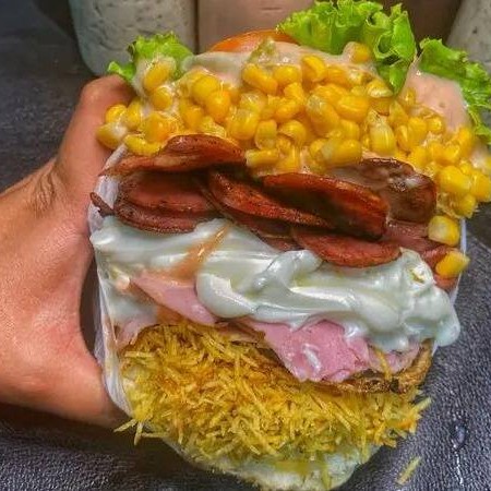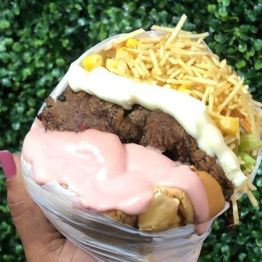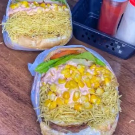 Pão, Carne, Alface, Queijo, tomate e Milho