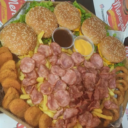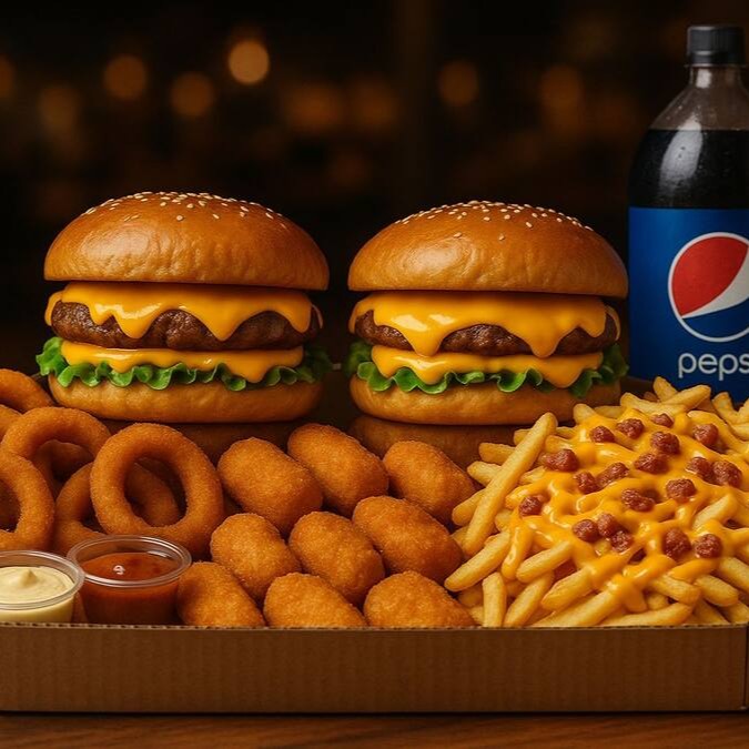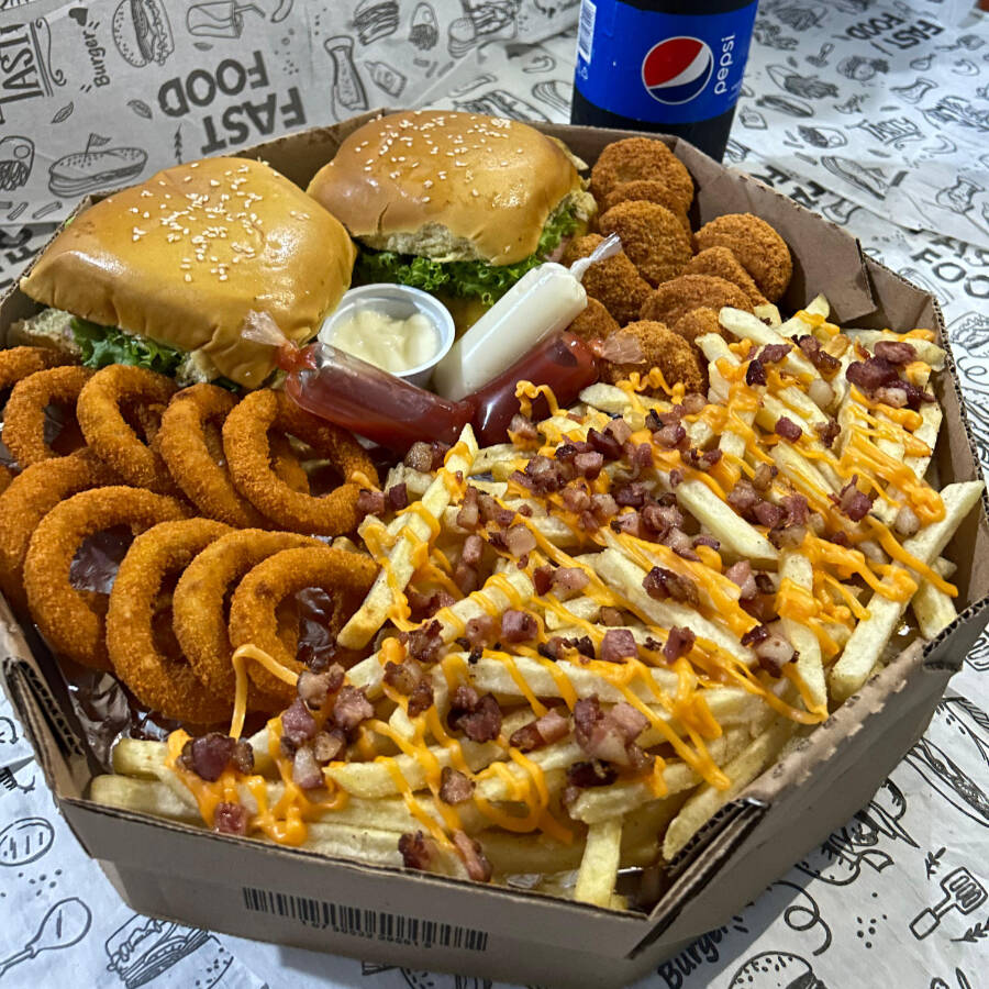2 Smash Burger Bacon + 10 anéis de cebola + 10 Nuggts + Batata com Cheddar e Bacon + Refri 1 Litro